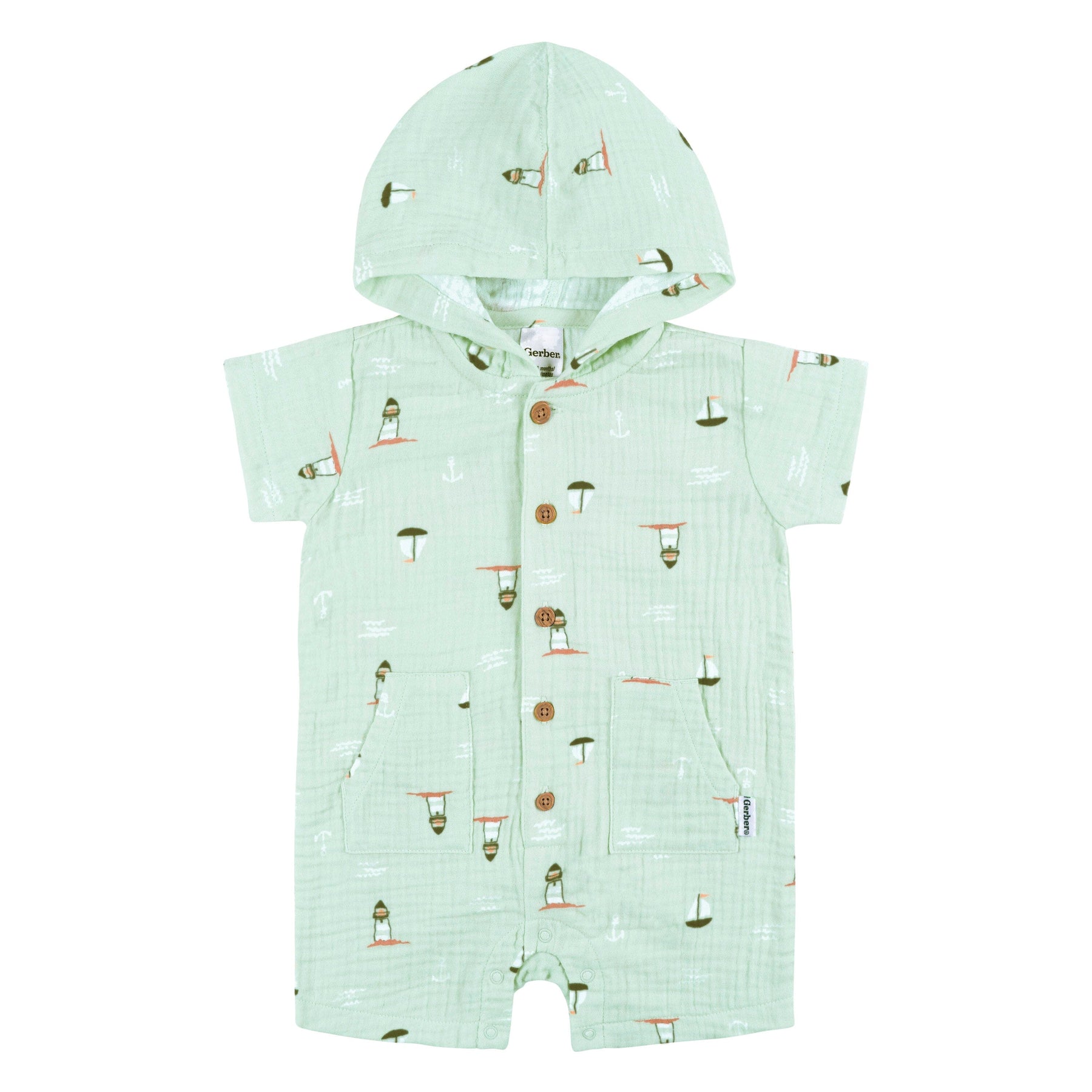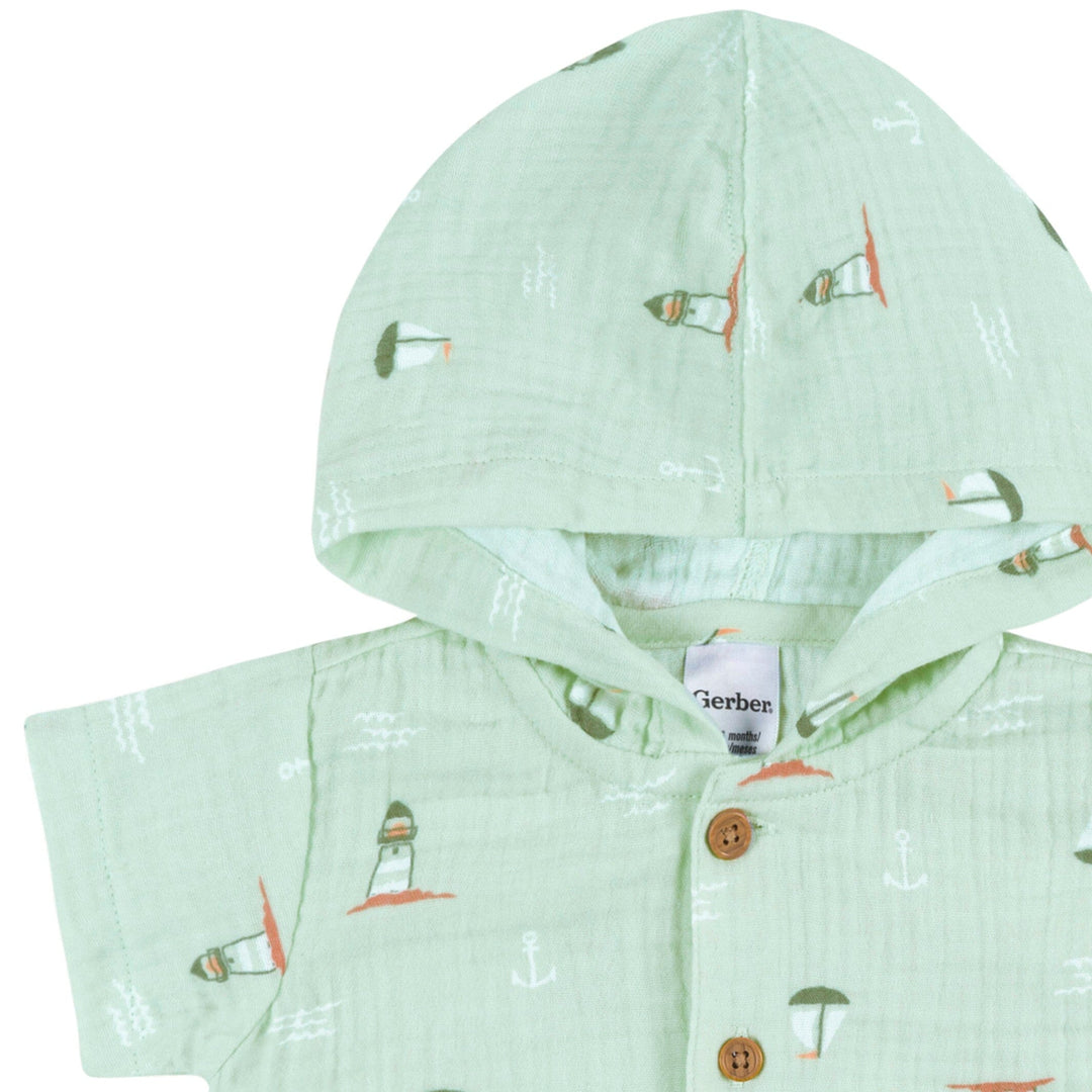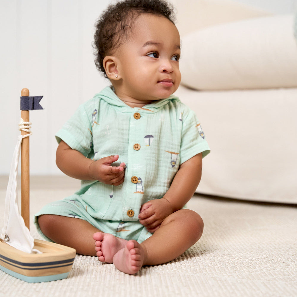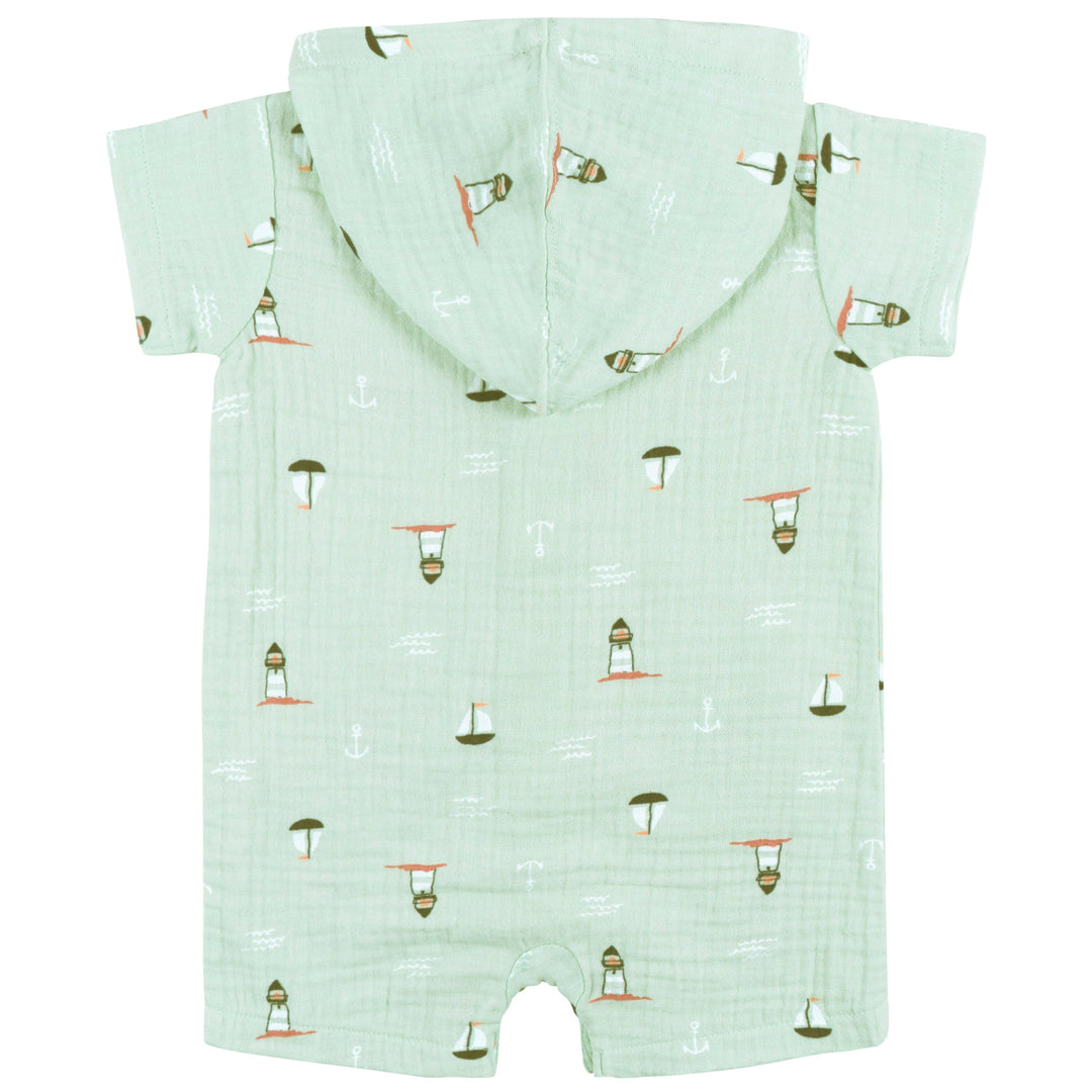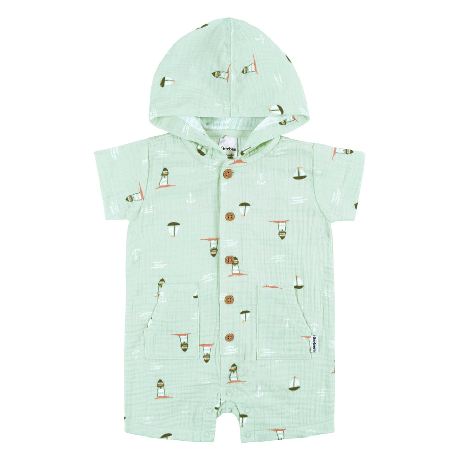 Keep your baby boy cool and comfortable on warm, sunny days with our adorable short-sleeve romper. Crafted with your little one in mind, this romper is the perfect choice for spring and summer. Made from 100% cotton gauze, it's incredibly soft and gentle on your baby's sensitive skin, ensuring a comfortable fit all day long. Convenient leg snaps make diaper changes easy, while the button-down front provides a cozy fit, and the soft hood helps protect your little one from sun. Our essentials have been independently certified with STANDARD 100 by OEKO-TEX® so that you don’t have to worry about harmful substances in your baby’s wardrobe. Includes one romper.