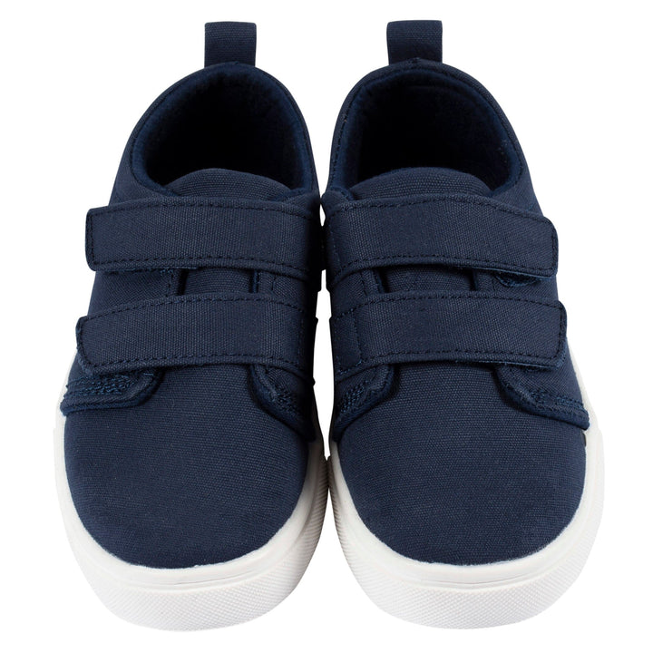 Get ready for play time with these toddler boys sneakers. With a double hook and loop strap over top, these shoes will remain secure all day long. Made from soft cotton with a durable rubber sole. Pack includes one pair of navy sneakers.