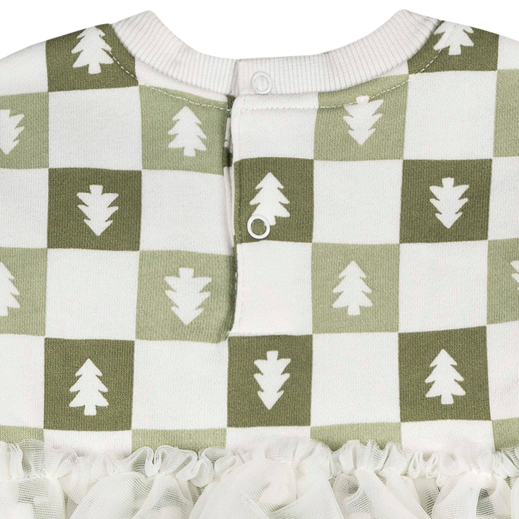 Make the holidays extra special with this adorable dress! The soft and stretchy fabric keeps little ones comfy while they play, while the ribbed neckline and wrists offer just the right amount of flexibility. Made with an easy pull-on fit and back-of-neck snaps, the simple design makes dressing easy. A drop-shoulder design adds a relaxed touch, and the flowy tulle skirt brings festive charm. The green and white checkered print, sprinkled with evergreen trees, is perfect for holiday celebrations and cozy family gatherings. Our essentials have been independently certified with STANDARD 100 by OEKO-TEX® so that you don’t have to worry about harmful substances in your little one’s wardrobe. Includes one dress.