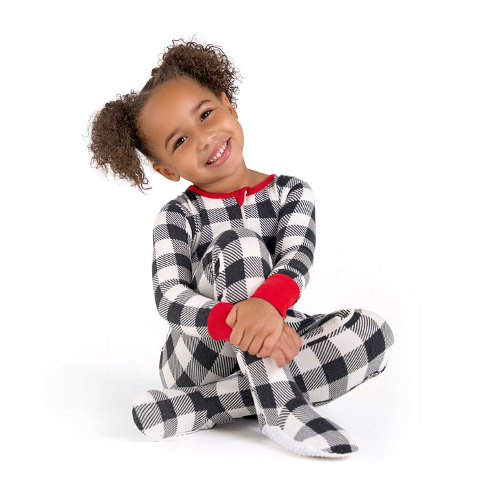 Nothing says the holidays are here like matching family pajamas! These snug, footed baby pajamas are comfortably cozy and perfect for cooler fall and winter nights. Featuring a black and white checkered pattern with red trim, they are part of a matching Christmas pajamas for the whole family. A full length zipper makes them easy to put on and take off, while a neckline zipper protector guards against accidental pinching. Super soft fabric helps your baby boy or baby girl sleep soundly, and easy machine wash and dry keeps them clean all season long. Our essentials have been independently certified with STANDARD 100 by OEKO-TEX® so that you don’t have to worry about harmful substances in your baby’s wardrobe. This pack contains one pair of baby footed pajamas.