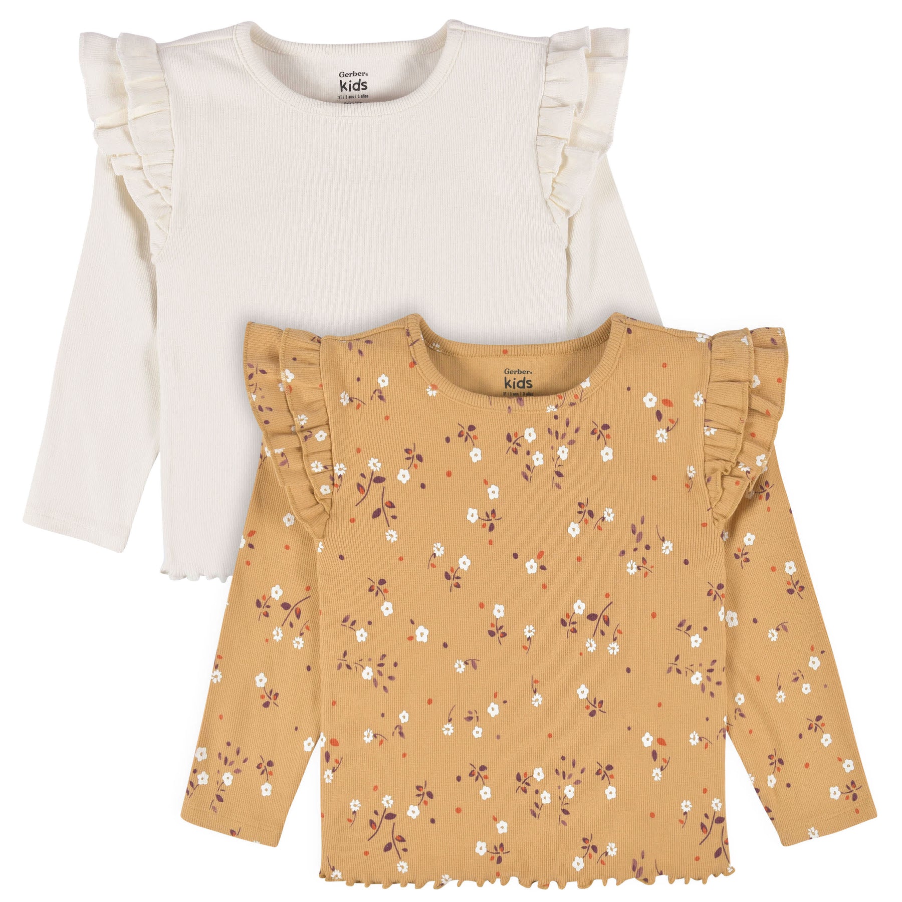 2-Pack Toddler Girls Mustard Floral Double Ruffle Tops, 5T