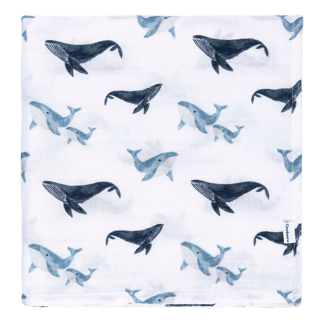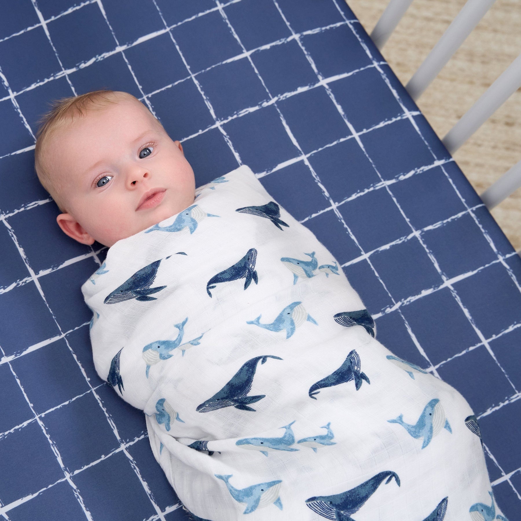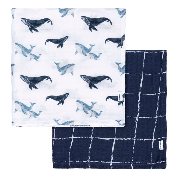 - One blanket is white with light and dark blue whale pattern, one blanket is blue plaid