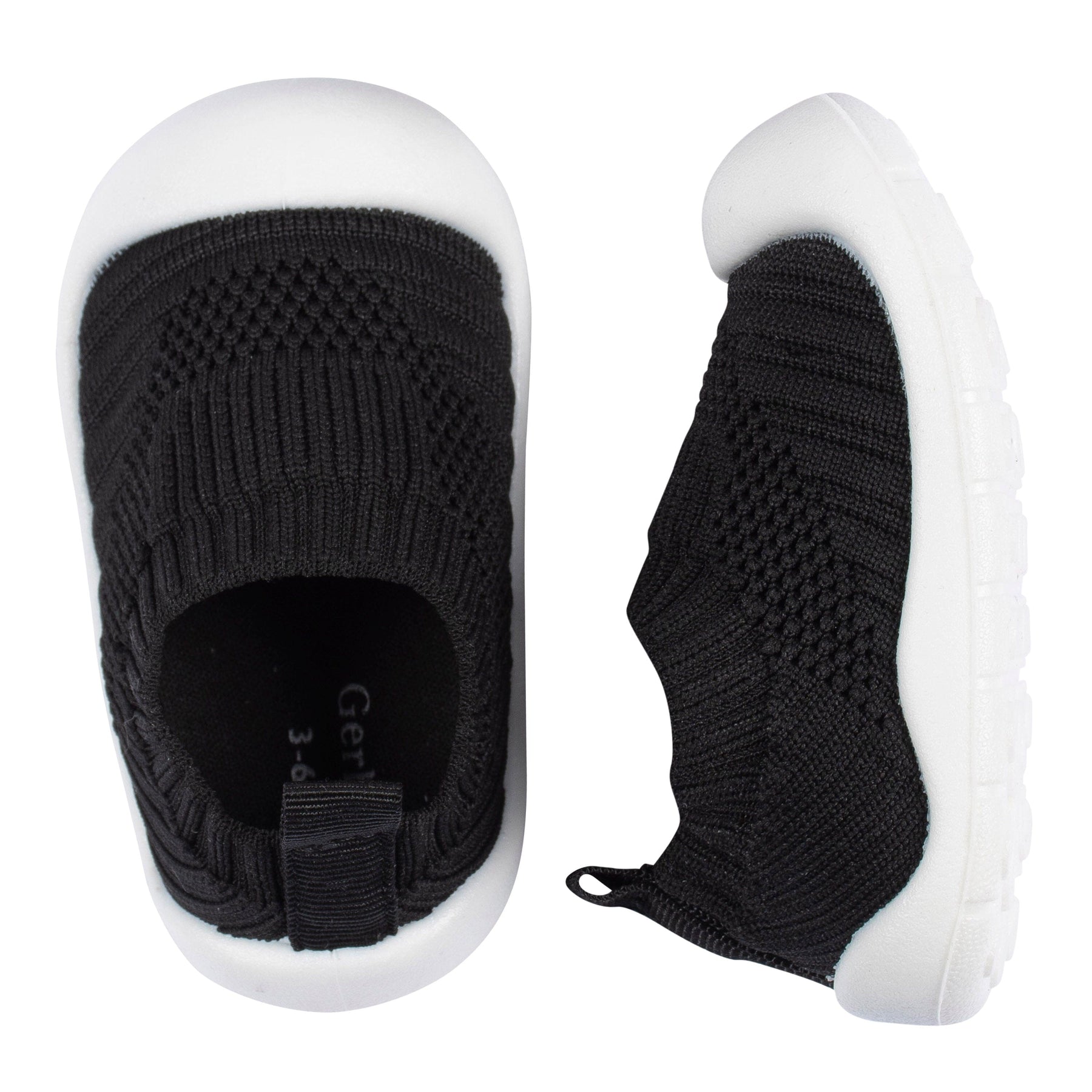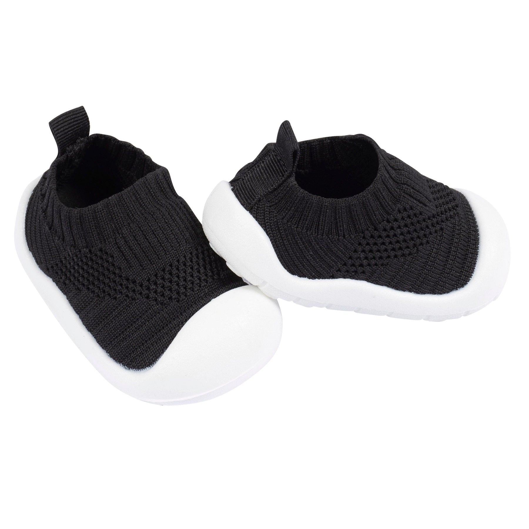 A soft, stretchy knit shoe with rubber sole provides a comfortable fit for your baby boy while keeping little feet warm and secure. Slips on easily for a hassle-free dress routine. Pack includes one pair of black slip-on shoes.
