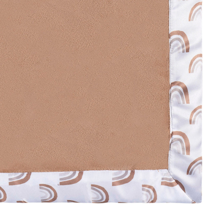 • Solid brown blanket, printed rainbow pattern on satin binding