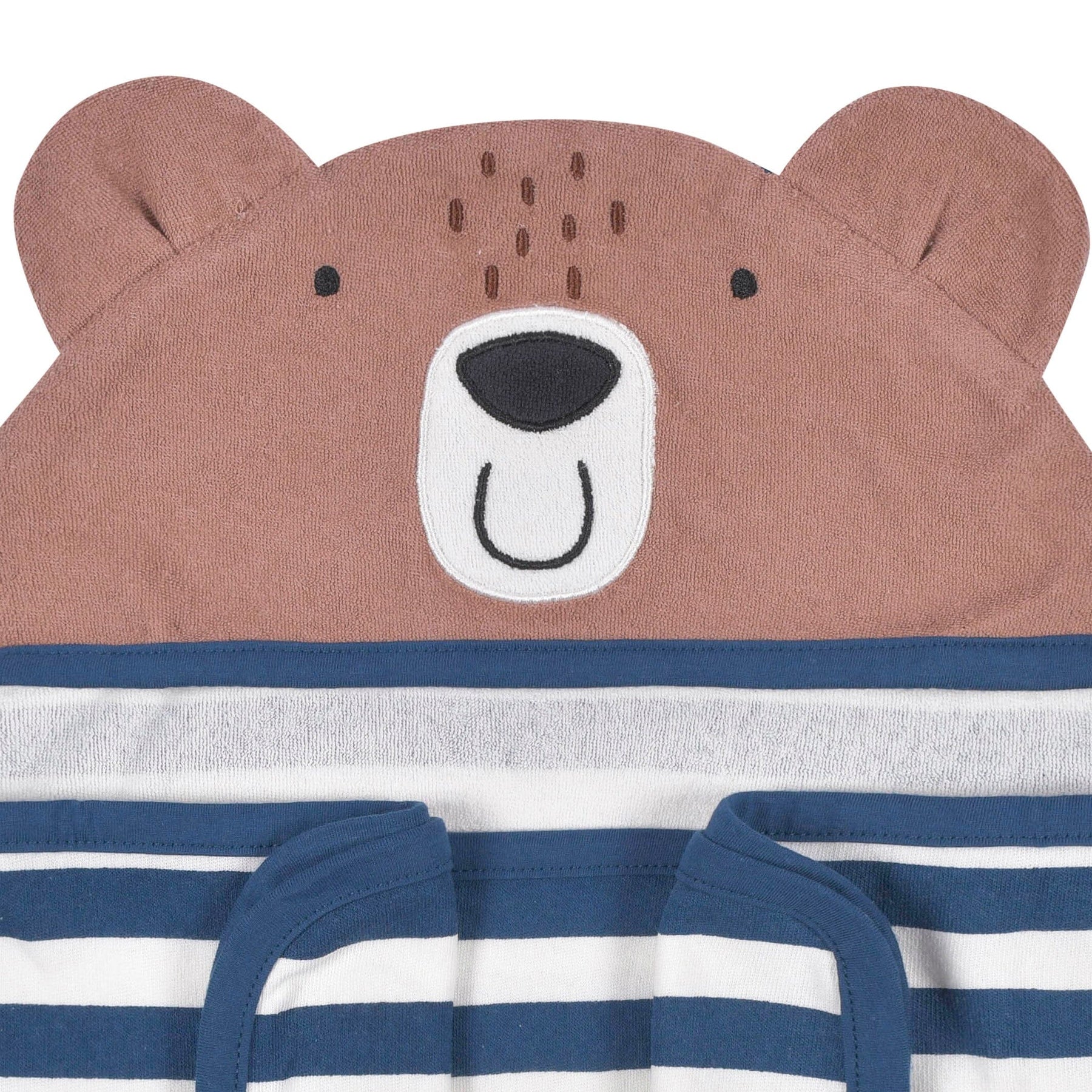 This adorable, hooded bath towel is essential for bath time. Dry your little one with our soft, absorbent baby towel made with cotton blended terry fabric. We use STANDARD 100 by OEKO-TEX® certification on products tested in an independent laboratory against a list of 400 harmful substances, including PFAS. This pack includes one baby boy hooded towel in navy and ivory with snuggly bear face hood.