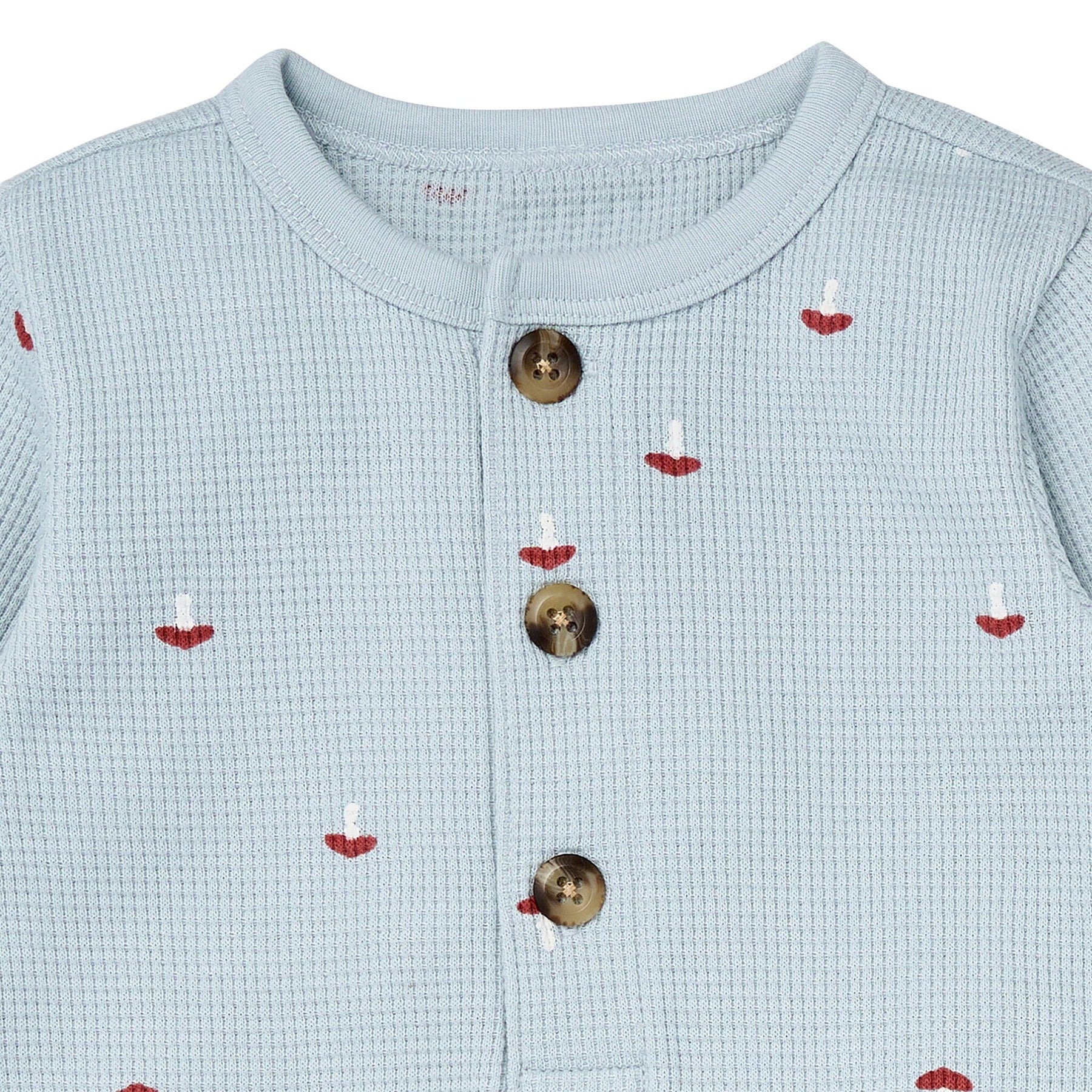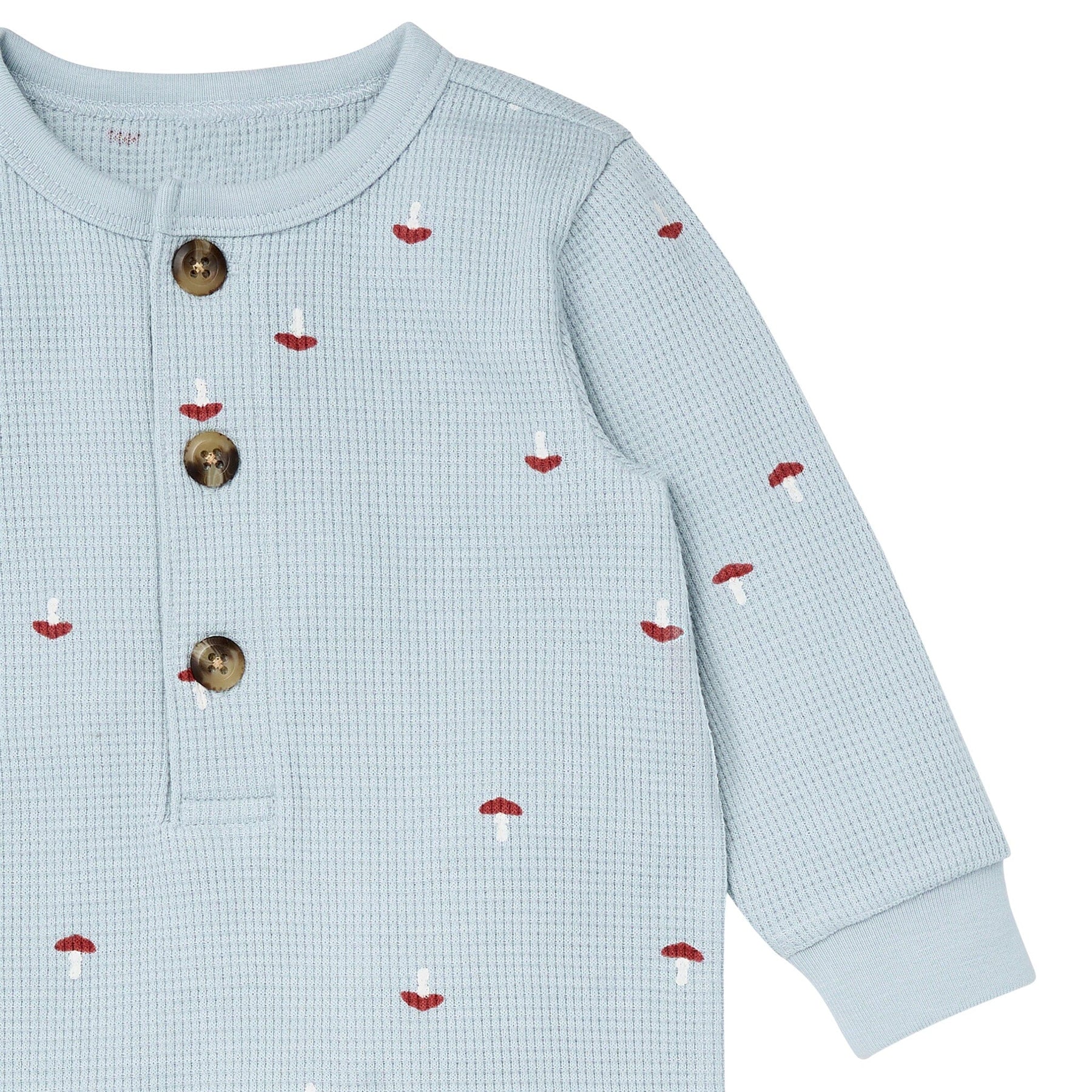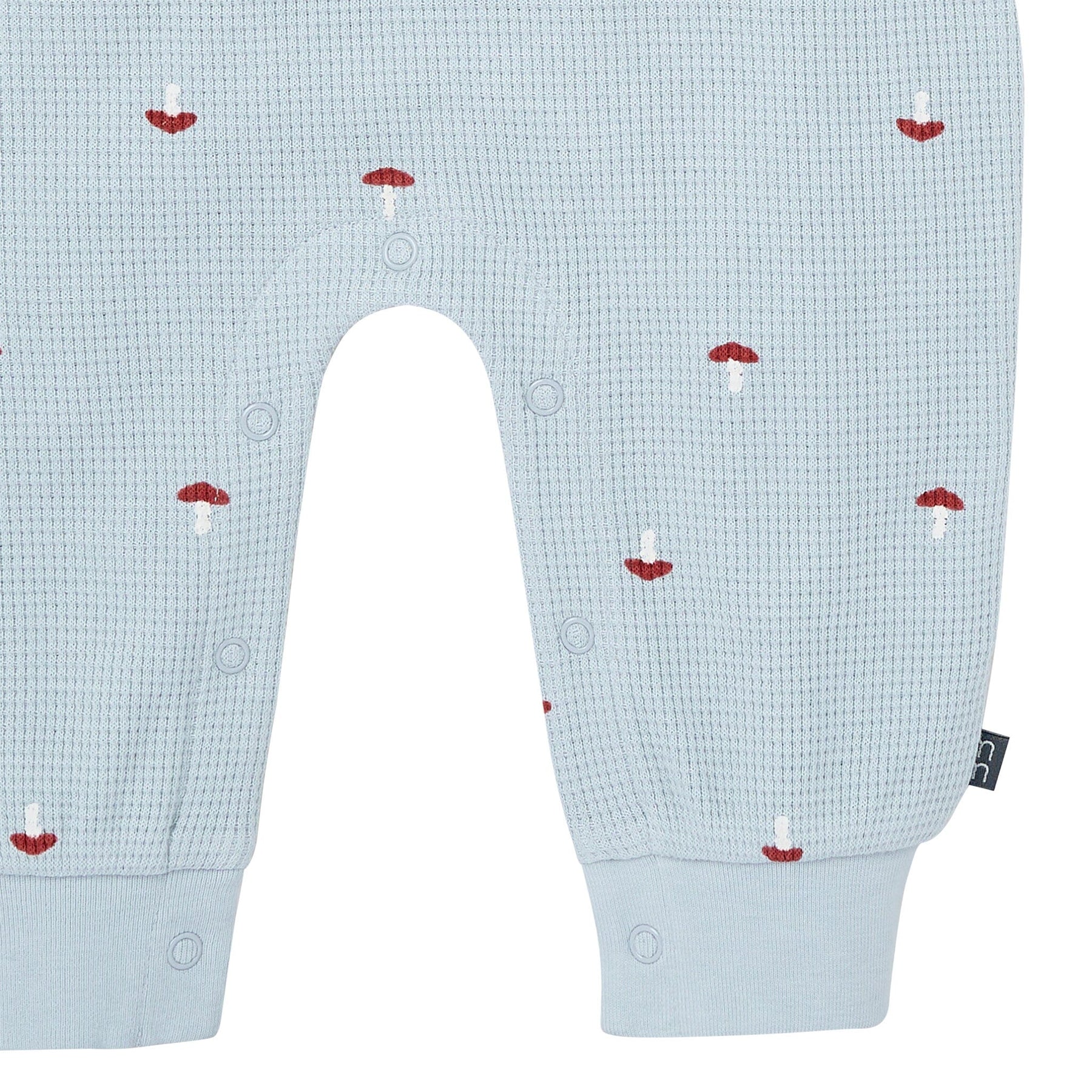 This baby boy romper is the perfect blend of softness and style for changing seasons. Made from stretchy waffle knit fabric, it gently hugs baby for a warm, breathable fit that moves with him. The long sleeves and full-length legs offer cozy coverage, while cinched ankles keep everything snug and in place. With leg snaps for easy diaper changes and faux wood buttons for a charming, rustic touch, this light blue romper is finished with a whimsical mushroom print—bringing just the right amount of forest-inspired fun to his everyday look. Our essentials have been independently certified with STANDARD 100 by OEKO-TEX® so that you don’t have to worry about harmful substances in your little one's wardrobe. Pack includes one long leg slouch romper from modern moments™ by Gerber®.