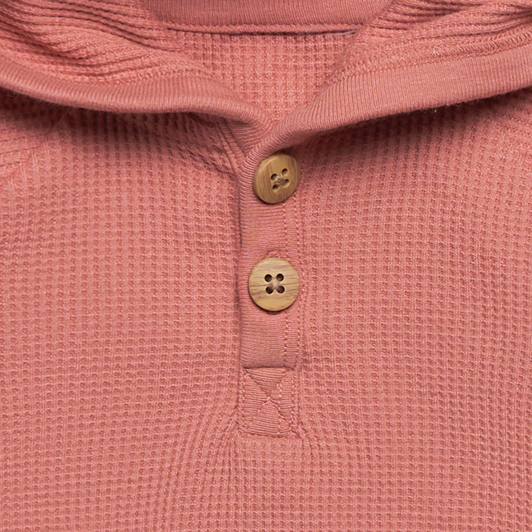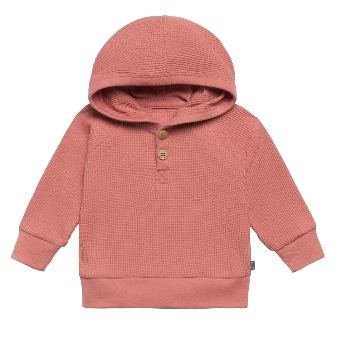 Dress your little one in comfort and style with our delightful hoodie and pants set, designed for active babies! Made from a cozy waffle fabric, this ensemble ensures a cozy feel that's perfect for cooler days. The soft hoodie is easy to layer over their outfit, while the hood itself provides extra warmth and protection from the elements. With a stretchy feel to move with your little one and faux wood buttons for a touch of charm, this set is as cute as it is practical. The pants feature a comfort-stretch waistband and ankles for a secure yet flexible fit, allowing free movement. Our essentials have been independently certified with STANDARD 100 by OEKO-TEX® so that you don’t have to worry about harmful substances in your little one’s wardrobe. Pack includes one hoodie with matching pants.