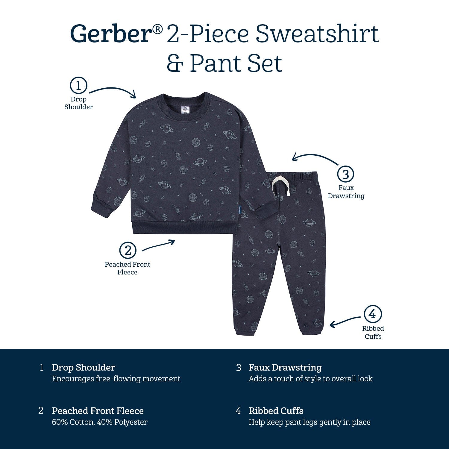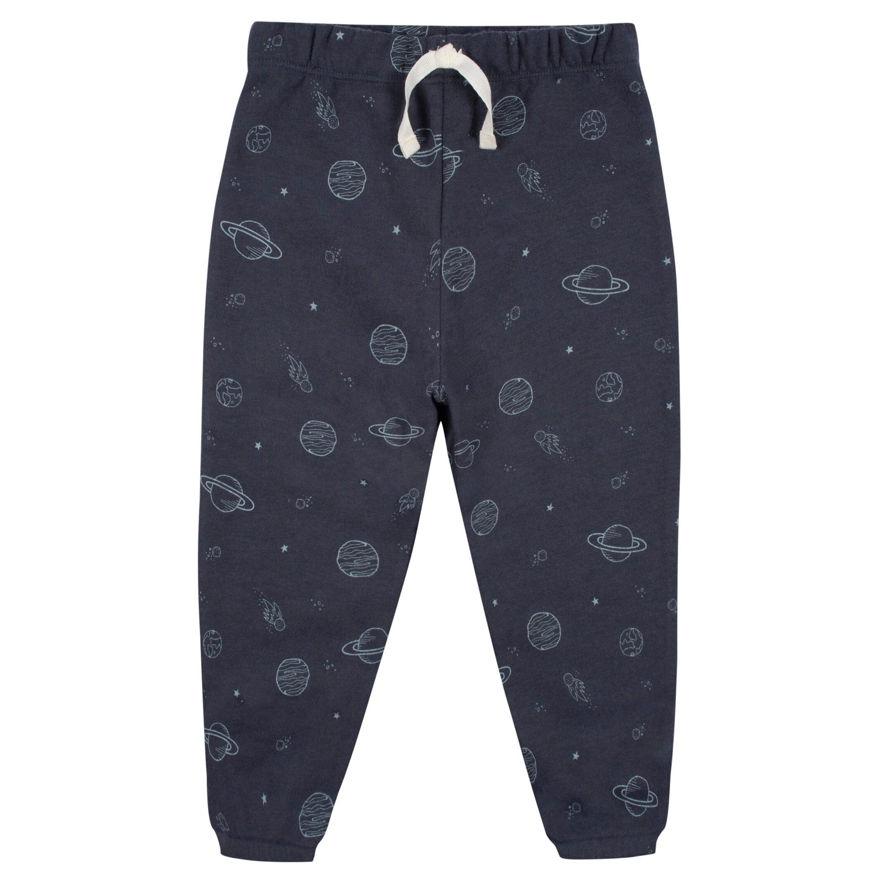 Made from warm and comfy cotton, this space-themed navy set is a super cozy outfit your baby boy or toddler boy will love wearing on chilly days. With a relaxed fit and comfort-stretch ribbing at the neck, wrists, waist and ankles, this set is the perfect outfit no matter where the day takes you. From playtime to running errands or just a lazy day indoors, he'll love to wear it anywhere. A snug waistline keeps the pants in place, while a faux drawstring completes the look. Our essentials have been independently certified with STANDARD 100 by OEKO-TEX® so that you don’t have to worry about harmful substances in your baby’s wardrobe. This pack includes one top with matching pants.
