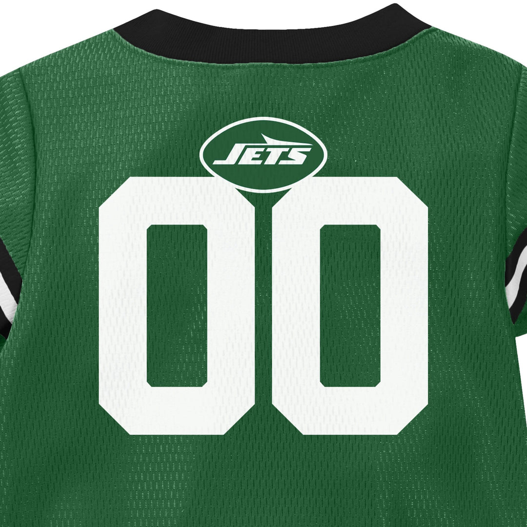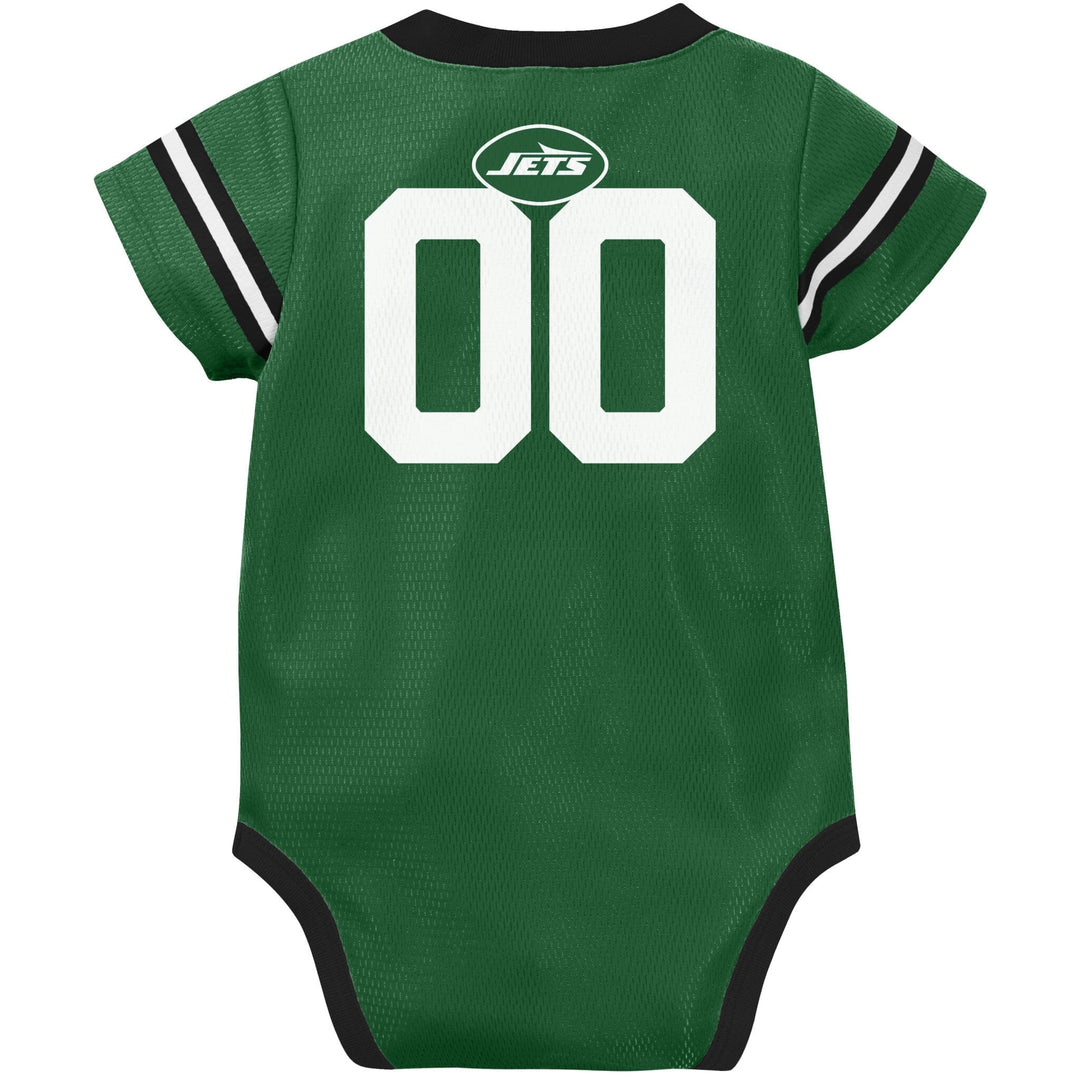 This officially licensed NFL bodysuit is the perfect first Jets “jersey” for your little one! Your will stay comfy throughout the entire game (and day!) in the polyester mesh fabric of this NFL bodysuit. The bodysuit features a V-neck with a shoulder placket to keep changes comfortable and quick. The bodysuit also features jersey numbers on the back and a team logo front and center to show off ’s team pride. The bottom snaps are positioned for convenient diaper changes, so taking breaks from the game won’t last long. This boys’ bodysuit is a great choice for warm or cool game days, as it may be layered over or worn all on its own. This bodysuit is machine washable for your convenience.