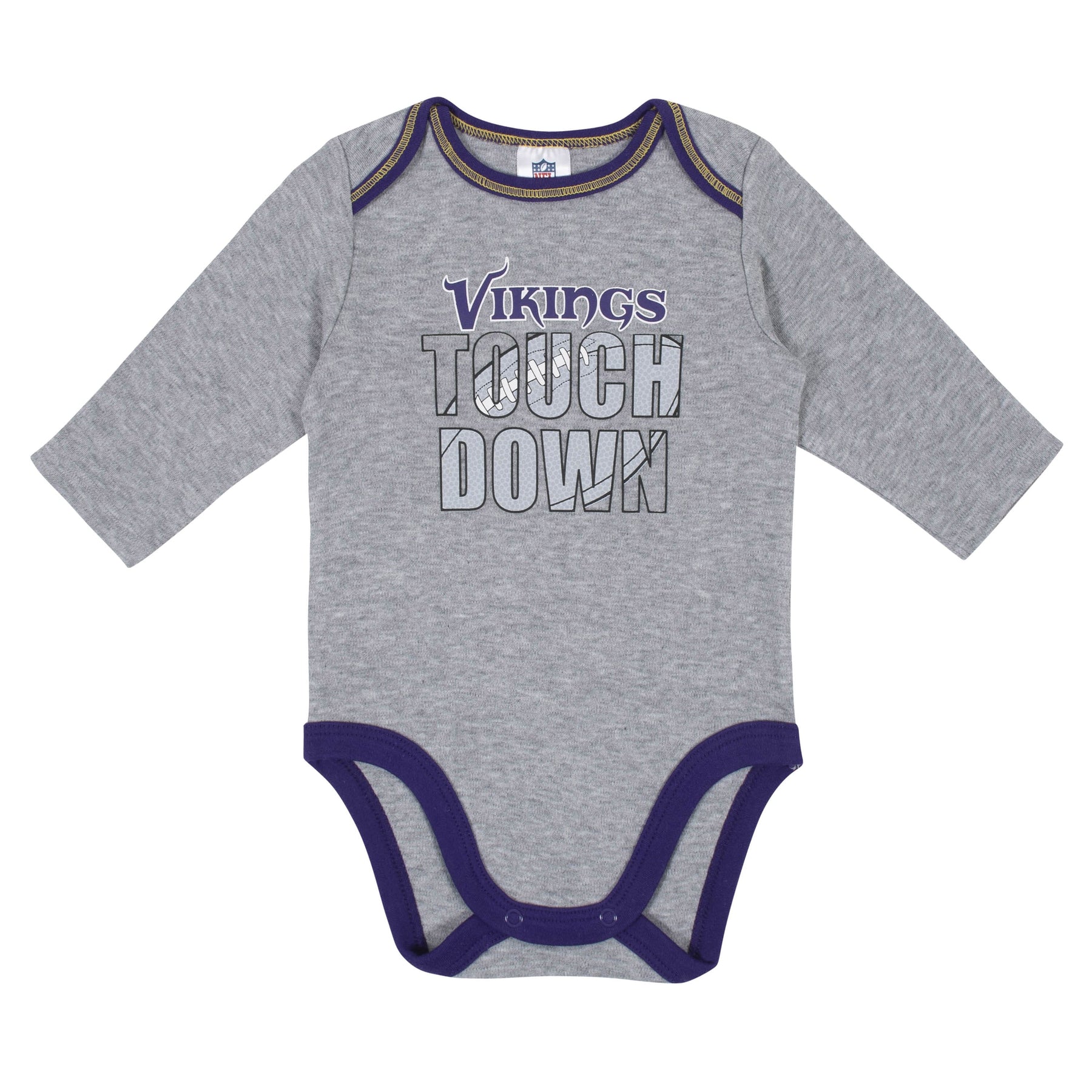 Get your little boy ready to take the field with this baby boys' officially licensed Minnesota Vikings long sleeve bodysuit 2-pack set! Gridiron-inspired screenprint with contrast coverstitch frames the Vikings logo to perfection. The cotton/poly blend interlock ensures he's feeling his best from the opening kickoff to the final seconds of the game. An expandable lap shoulder neckline makes it easy for mom to dress him out on game days. A higher-in-the-front bottom snap closure simplifies diaper duty. Laundry day stays hassle-free with these easy care items!