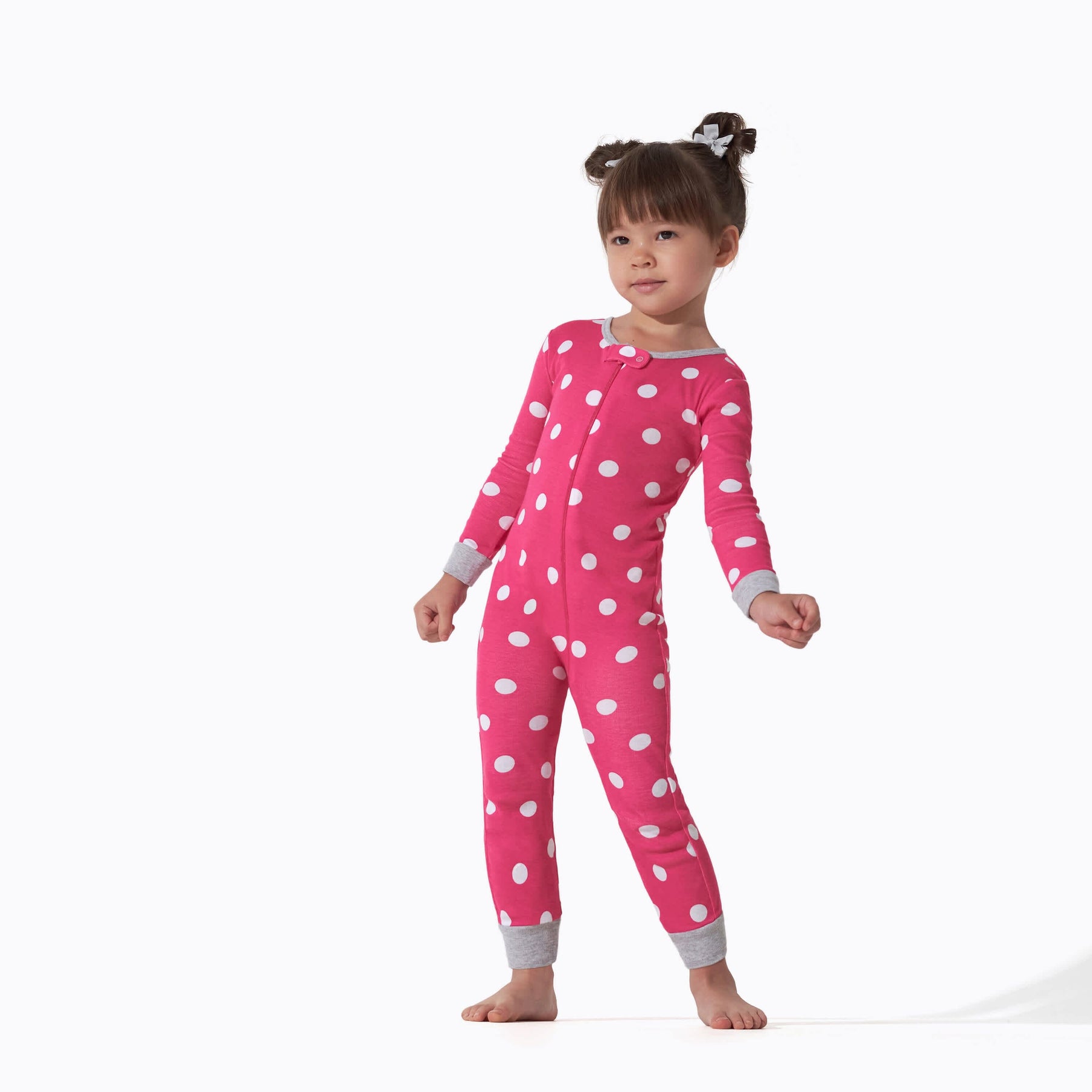 Make bedtime fun with these dots and kitties themed PJs! Our snug fit one-piece cotton pajamas are soft and safe, perfect for sleeping or lounging! We use STANDARD 100 by OEKO-TEX® certification on products tested in an independent laboratory against a list of more than 400 harmful substances, including PFAS.