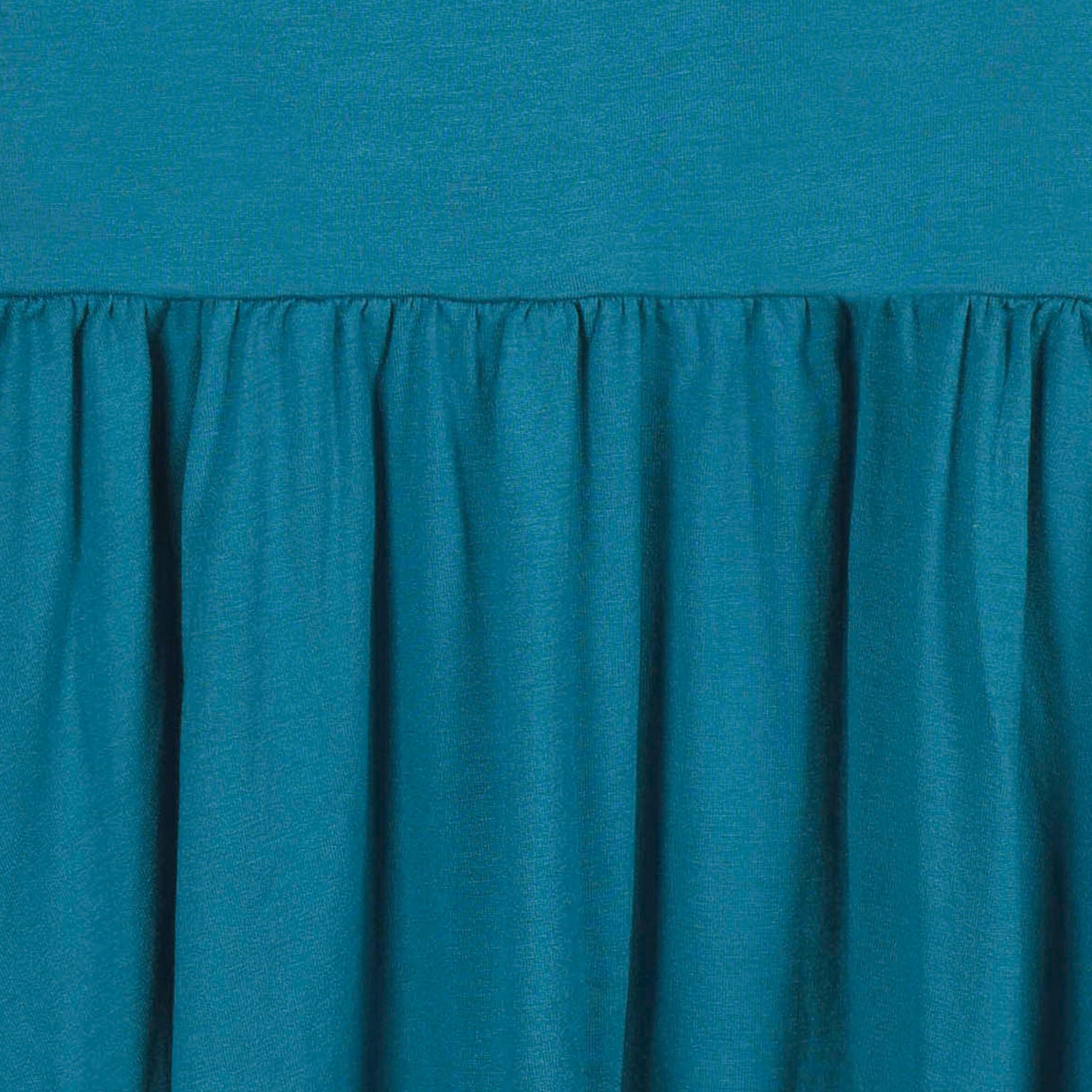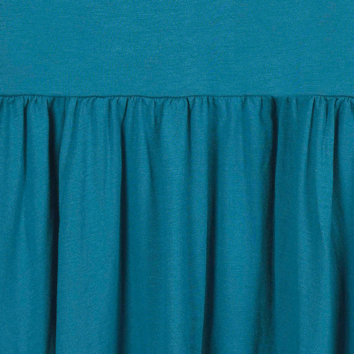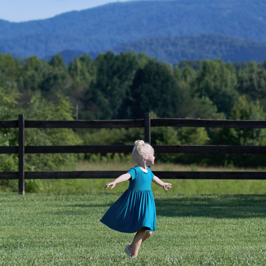 Designed for every season, our buttery soft collection of affordable rompers, sleepwear, Dresses and headbands will be their new wardrobe faves! We've partnered with Livaeco™ by Birla Cellulose to bring you and your little ones a more sustainably produced, environmentally-friendly viscose fiber collection made predominately from eucalyptus blended with spandex. This extremely soft solid teal blue Dress is made for twirling. The perfect look for any occasion. High-quality, lightweight, breathable, durable fabric with the perfect amount of stretch for active babies and toddlers. Prints and solids made for sibling matching. This short sleeve twirl Dress is comfy fitting for all day wear. Gerber® quality, comfort, safety and value never goes out of style!