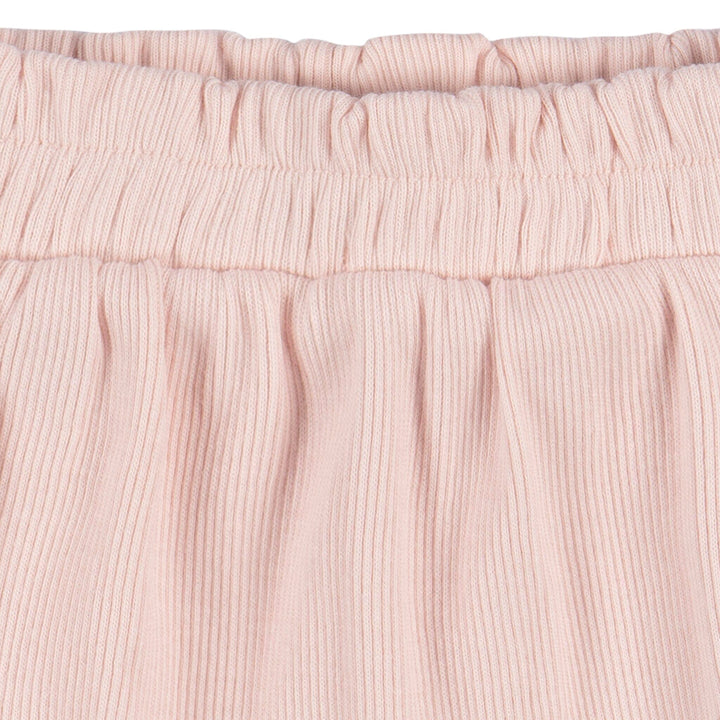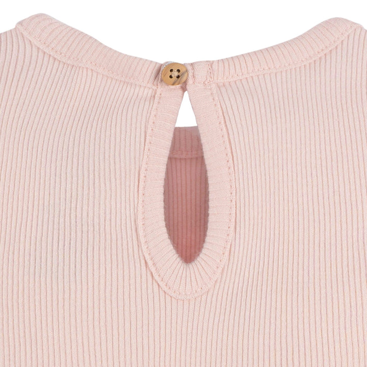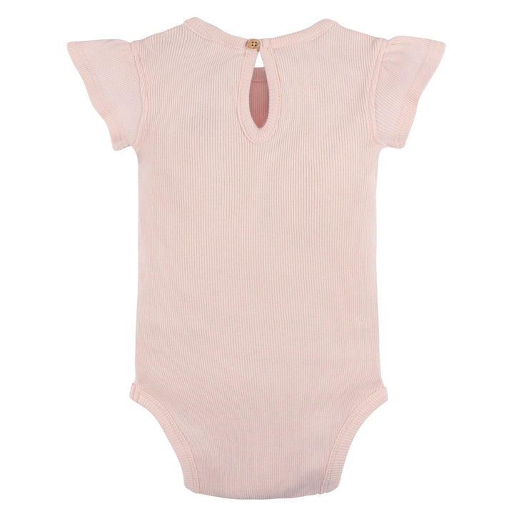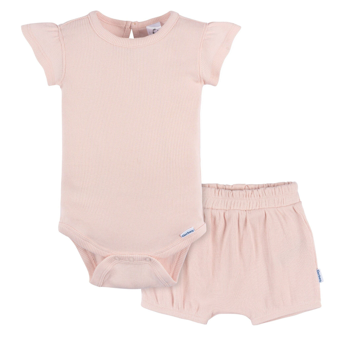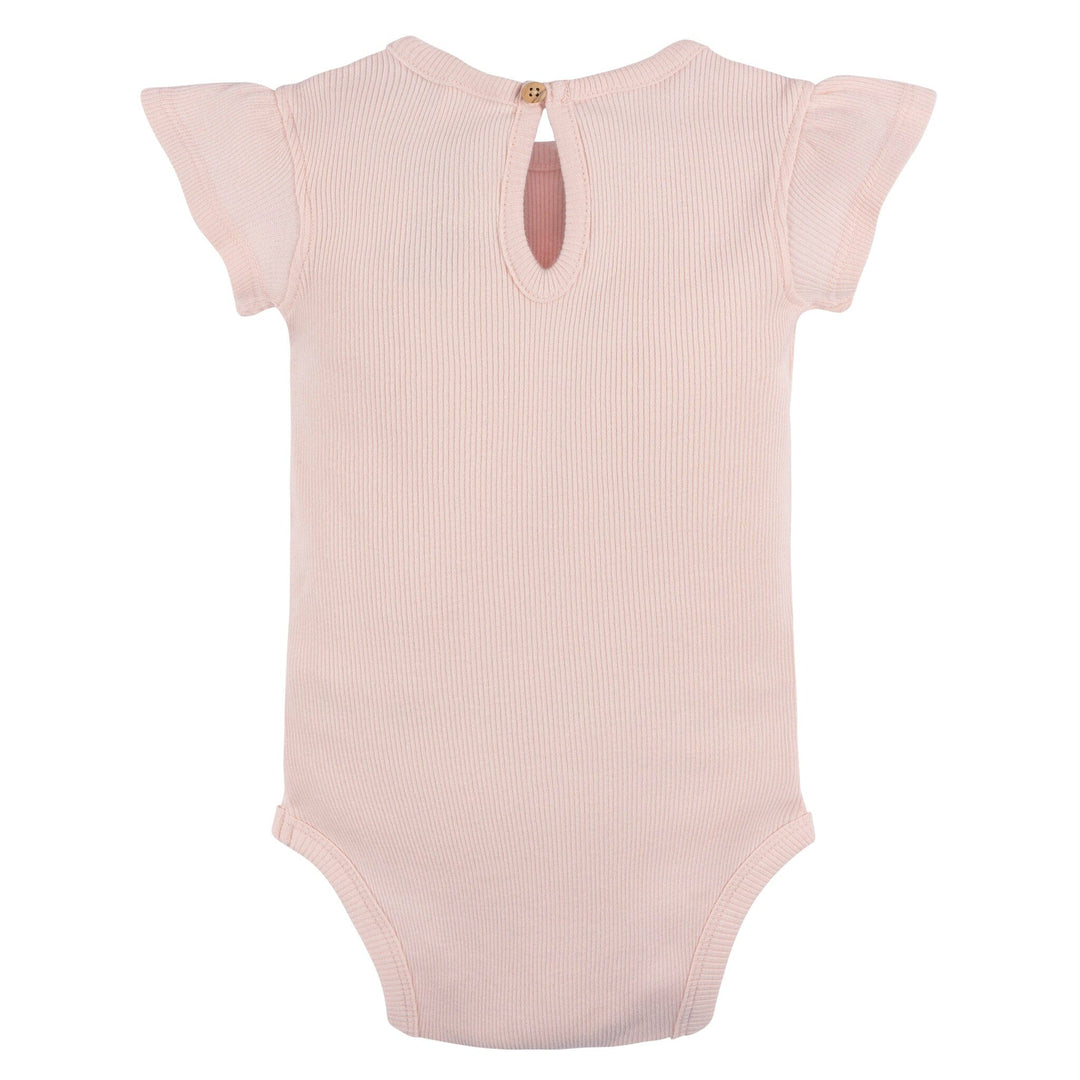 Dress your baby girl in this delightful pink bodysuit and shorts set, designed to be soft and gentle on delicate skin with its 100% cotton fabric. The bodysuit’s vertical ribbing provides a flexible fit, while the ruffled sleeves give it an extra touch of sweetness. Convenient leg snaps make diaper changes simple, and the matching shorts feature a comfort-stretch waistband with playful ruffles for a cute, stylish finish. Whether for a day out or playtime at home, this set ensures your baby stays comfortable and adorable. Our essentials have been independently certified with STANDARD 100 by OEKO-TEX® so that you don’t have to worry about harmful substances in your baby's wardrobe. Includes one bodysuit with matching shorts.