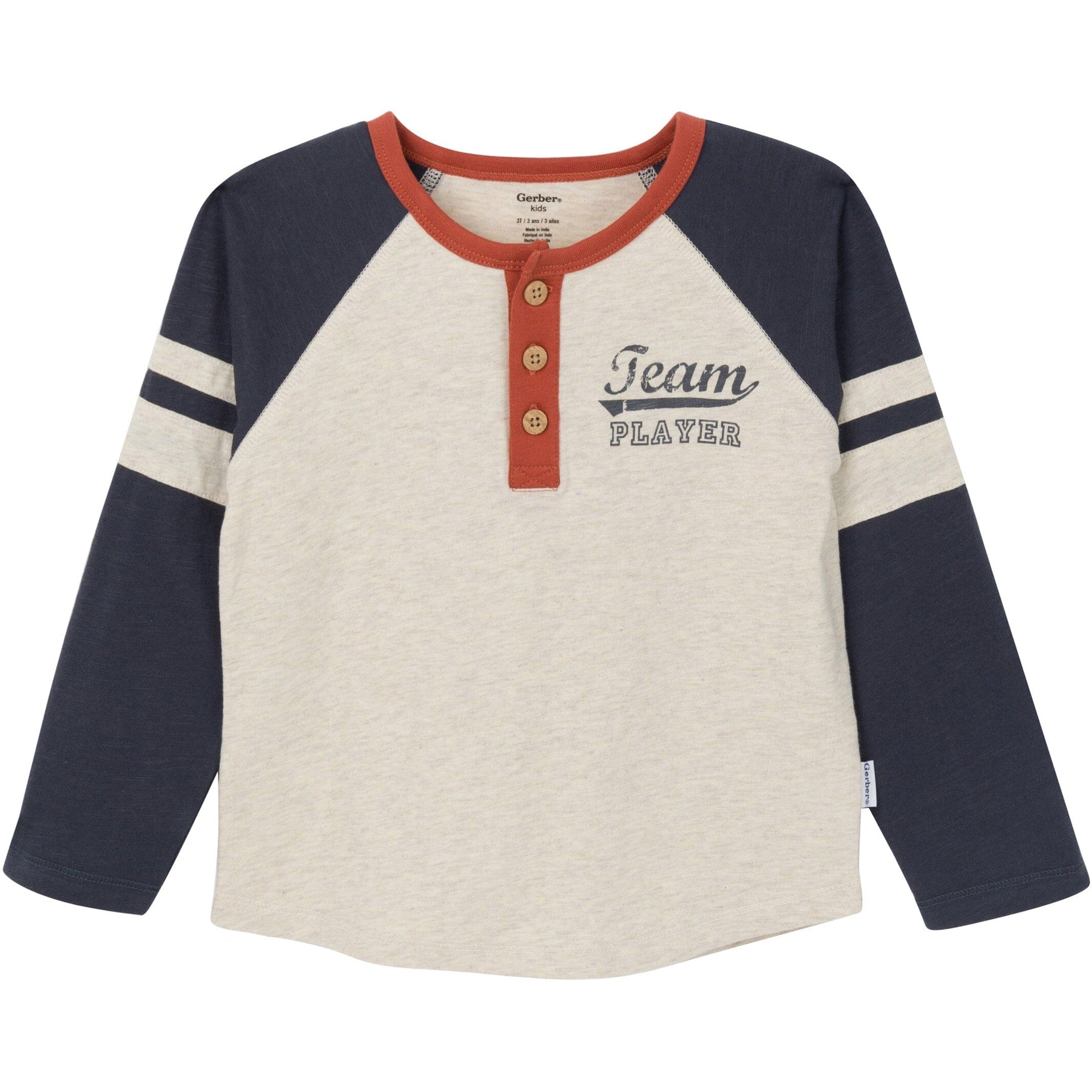 • Faux wood buttons on pants and shirt, text on shirt reads """"team player""""