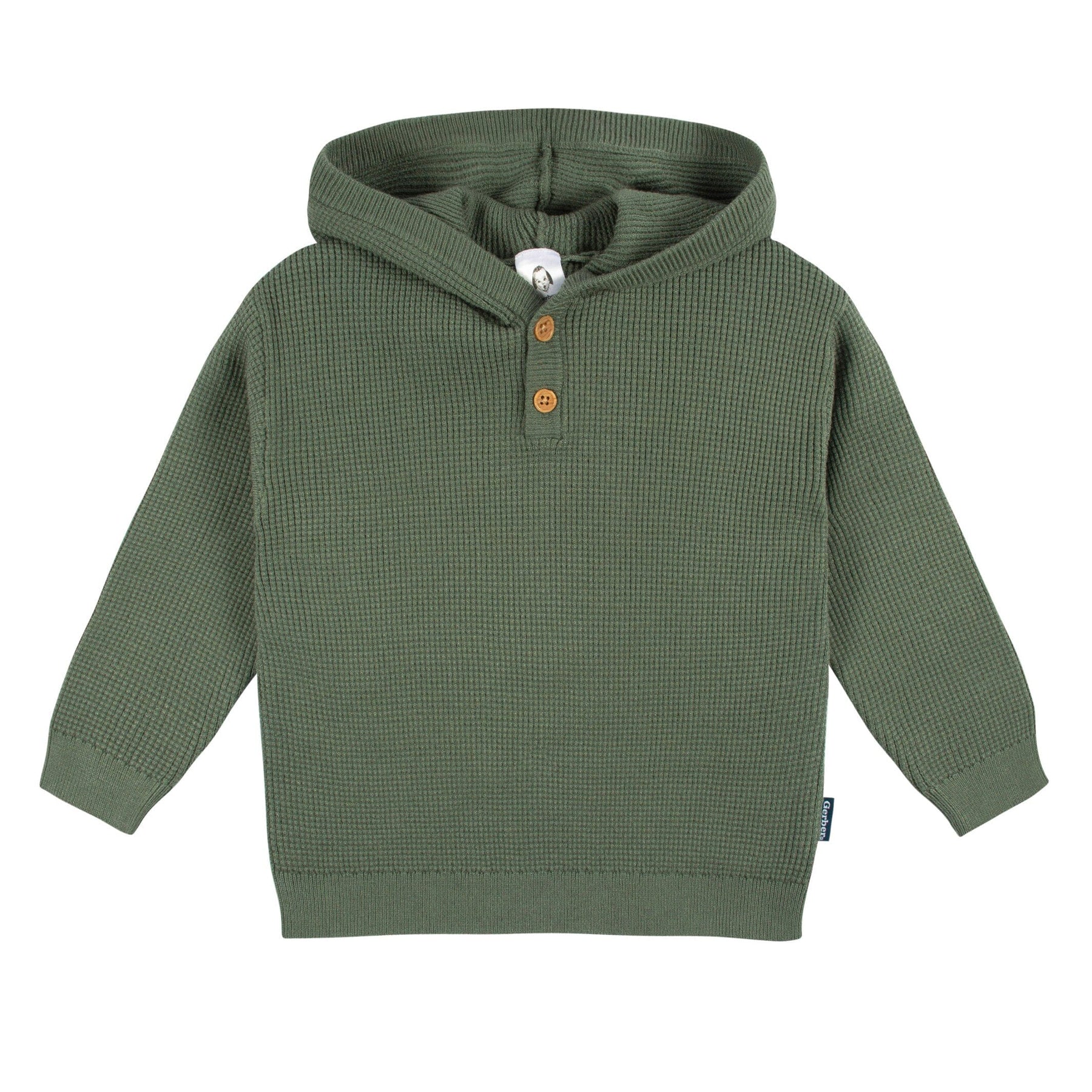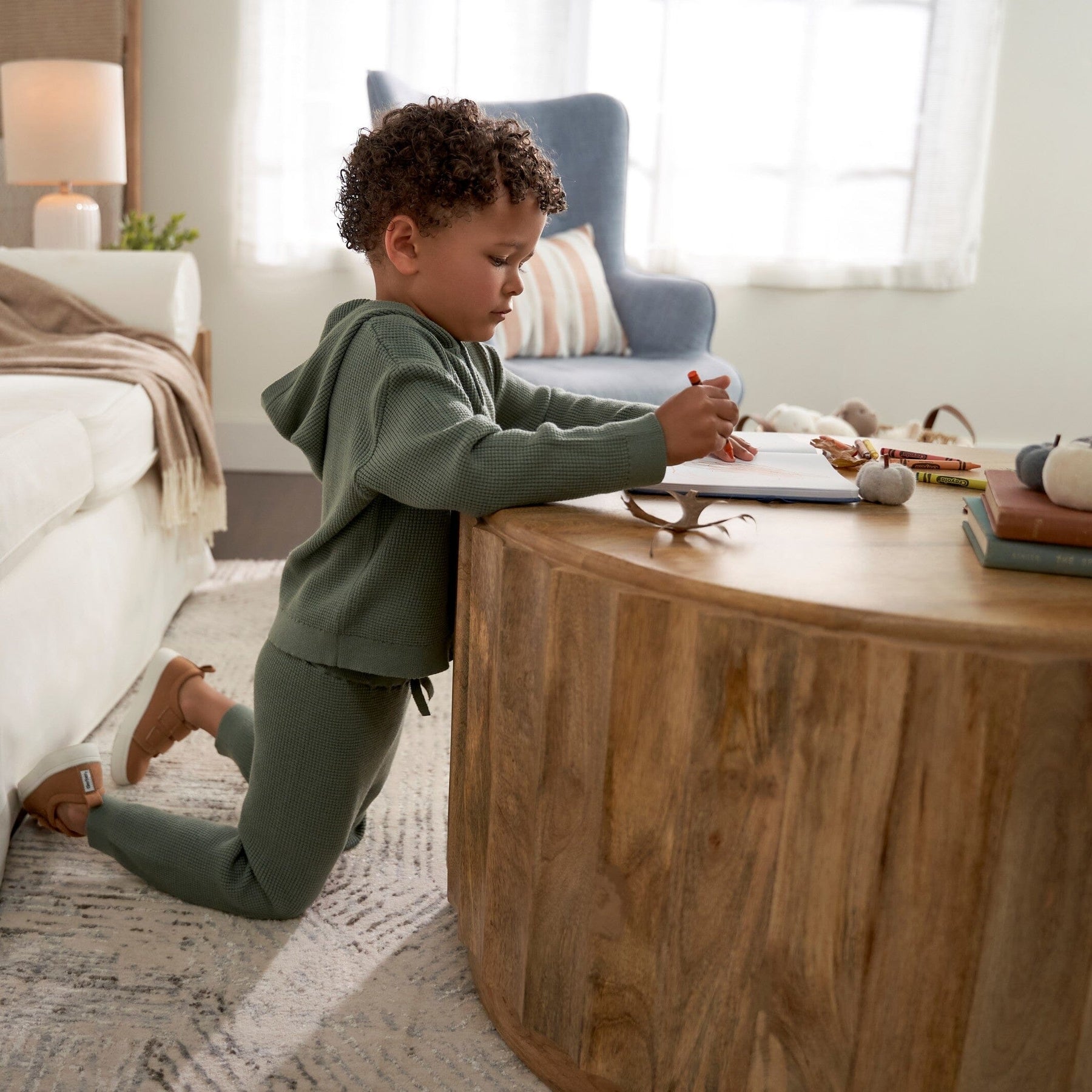 Made from super soft and comfy fabric, this matching olive green set features a cozy hoodie for extra warmth and comfort-stretch at the neck, wrists, waist, and ankles. The relaxed fit and easy on and off design is perfect for toddlers learning to dress themselves. The pullover top has two buttons, while the pullup pants feature a stretchy waistband for maximum comfort. The faux wood buttons and drawstring add an extra touch of style to this already adorable set. Our essentials have been independently certified with STANDARD 100 by OEKO-TEX® so that you don’t have to worry about harmful substances in your infant’s wardrobe. This sweater knit set is easy to care for with machine washing/drying and includes one top and one bottom.