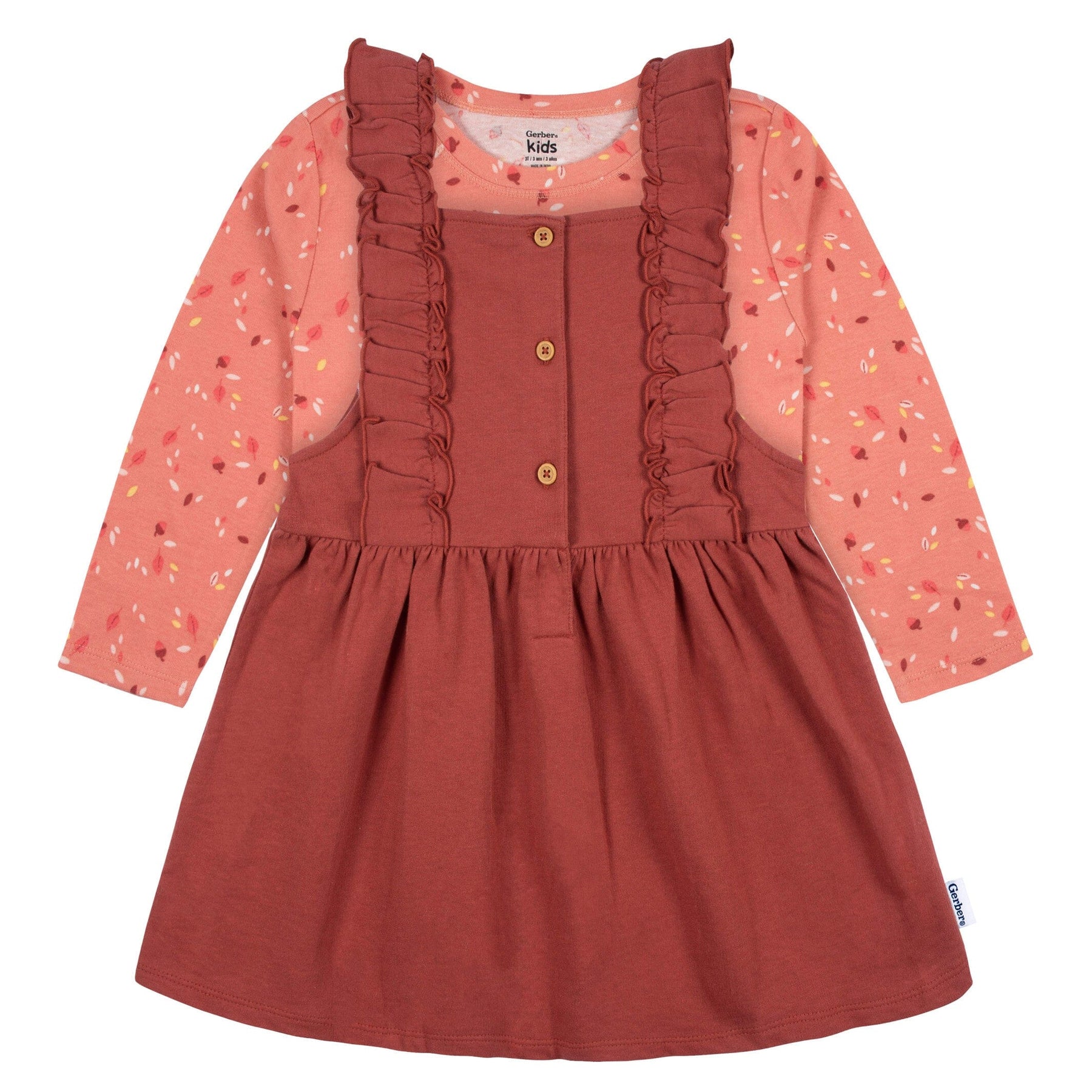 This fall themed, two-piece outfit will keep your baby girl warm and cozy all season long. Features an adorable jumper and matching, long sleeve t-shirt for a complete look. The jumper is made from a warm cotton and polyester blend, while the shirt is made from a slightly stretchy cotton to be gentle on sensitive skin. This picture-perfect outfit is equally great for special occasions or just running daily errands. Our essentials have been independently certified with STANDARD 100 by OEKO-TEX® so that you don’t have to worry about harmful substances in your baby’s wardrobe. This two piece set includes one orange jumper and one long sleeve shirt with matching falling leaves pattern.