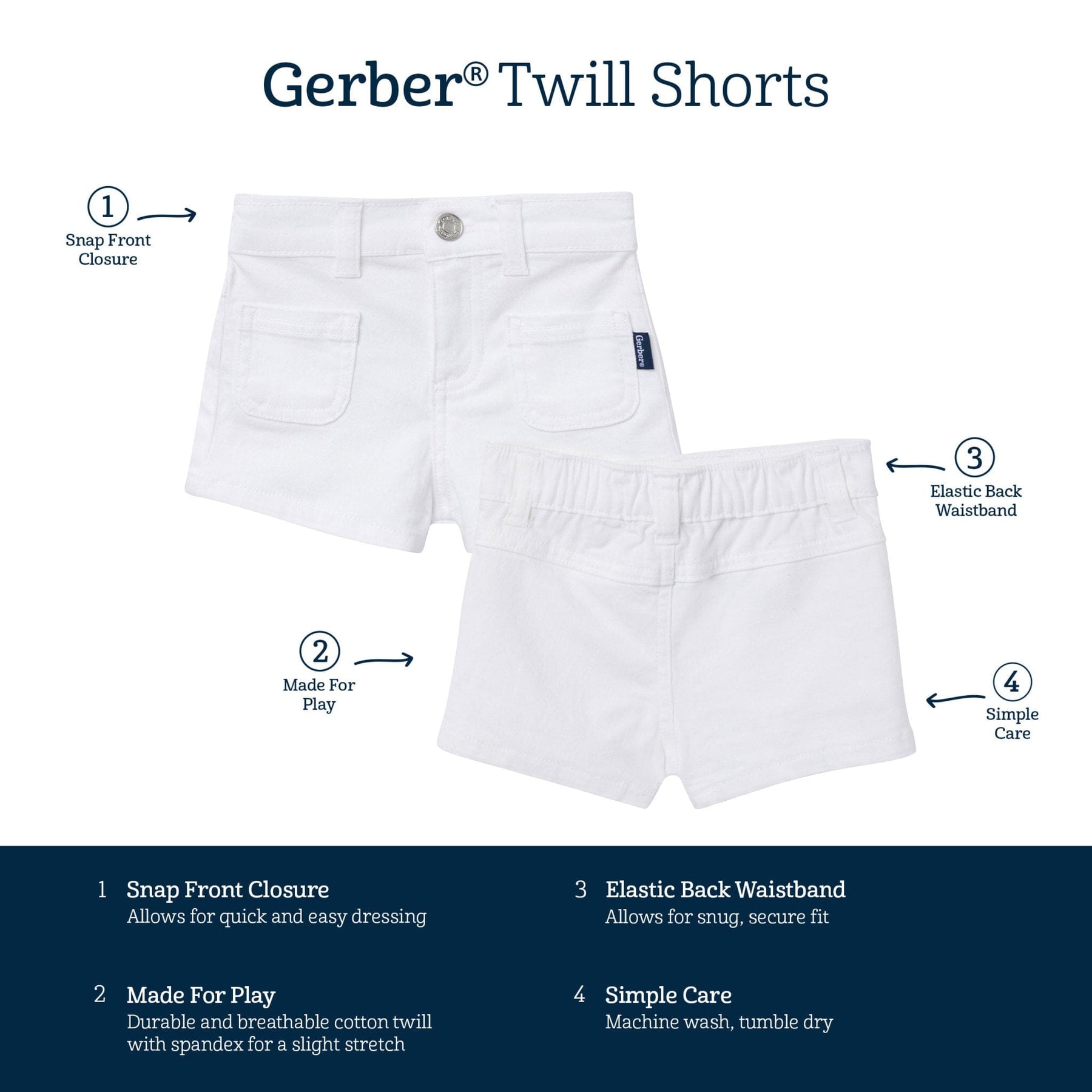 These baby and toddler girl shorts are perfect for all-day fun in the sun! Made from soft material with just a hint of stretch, they offer a flexible, comfy feel that lets her move freely. The elastic waistband at the back ensures a secure, easy fit, and functional pockets provide a handy spot for storing all her little treasures. In a timeless solid white, these shorts are the perfect match for any t-shirt or bodysuit, making them an easy and stylish choice for warm-weather playtime. Our essentials have been independently certified with STANDARD 100 by OEKO-TEX® so that you don’t have to worry about harmful substances in your baby’s wardrobe. Includes one pack of gender-neutral baby or toddler shorts.