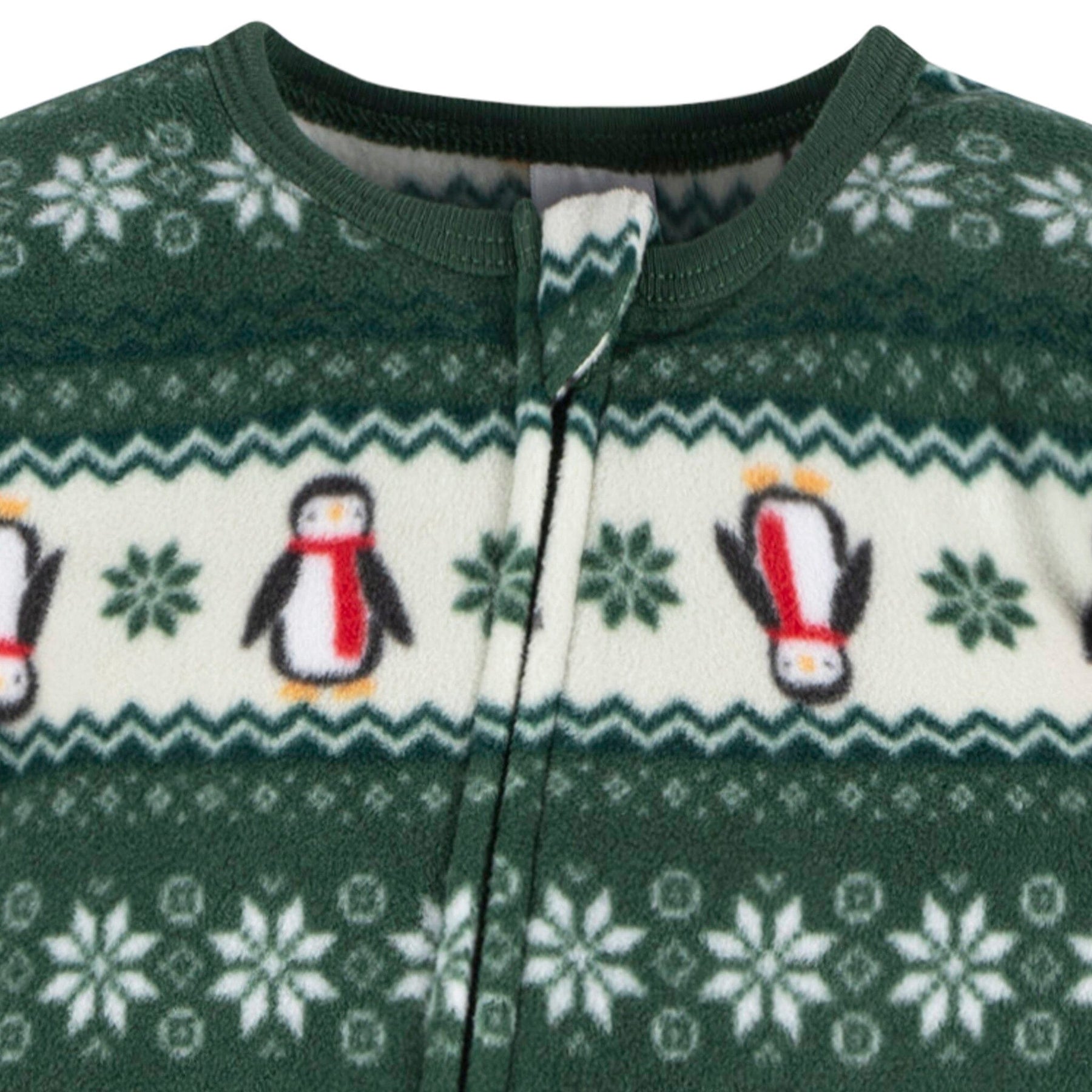 Keep your baby or toddler warm and happy all night long in this cozy microfleece footed pajama, designed with both comfort and cuteness in mind. Made from very soft microfleece, it features an adorable pattern of white snowflakes and penguins wearing red scarves, all set against a cheerful alternating light and dark green background. The two-way zipper makes diaper changes simple and stress-free, while the rounded, ribbed neckline with a soft zipper tab helps ensure comfort. Footed for extra warmth with non-skid soles for added grip, it’s the perfect pick for snuggly nights and playful mornings. Our essentials have been independently certified with STANDARD 100 by OEKO-TEX® so that you don’t have to worry about harmful substances in your baby’s wardrobe. One pack of footed pajamas.