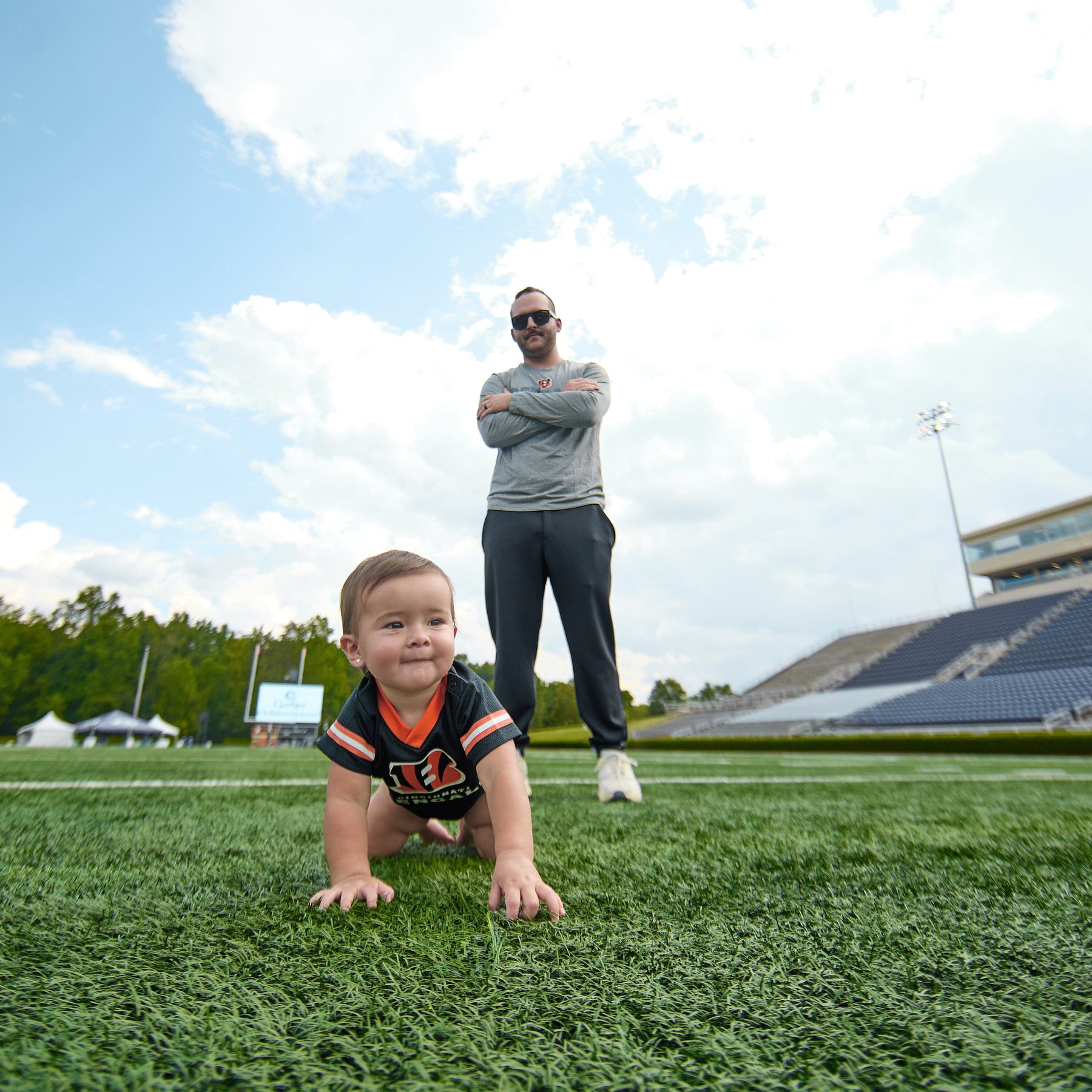 This officially licensed NFL bodysuit is the perfect first Bengals “jersey” for your little one! The bodysuit features a V-neck with a shoulder placket to keep changes comfortable and quick. The bodysuit also features jersey numbers 00 on the back and a team logo front and center to show off your team pride. The bottom snaps are positioned for convenient diaper changes, so taking breaks from the game won’t last long. This bodysuit is a great choice for warm or cool game days, as it may be layered with shorts or a pair of joggers or worn all on its own.