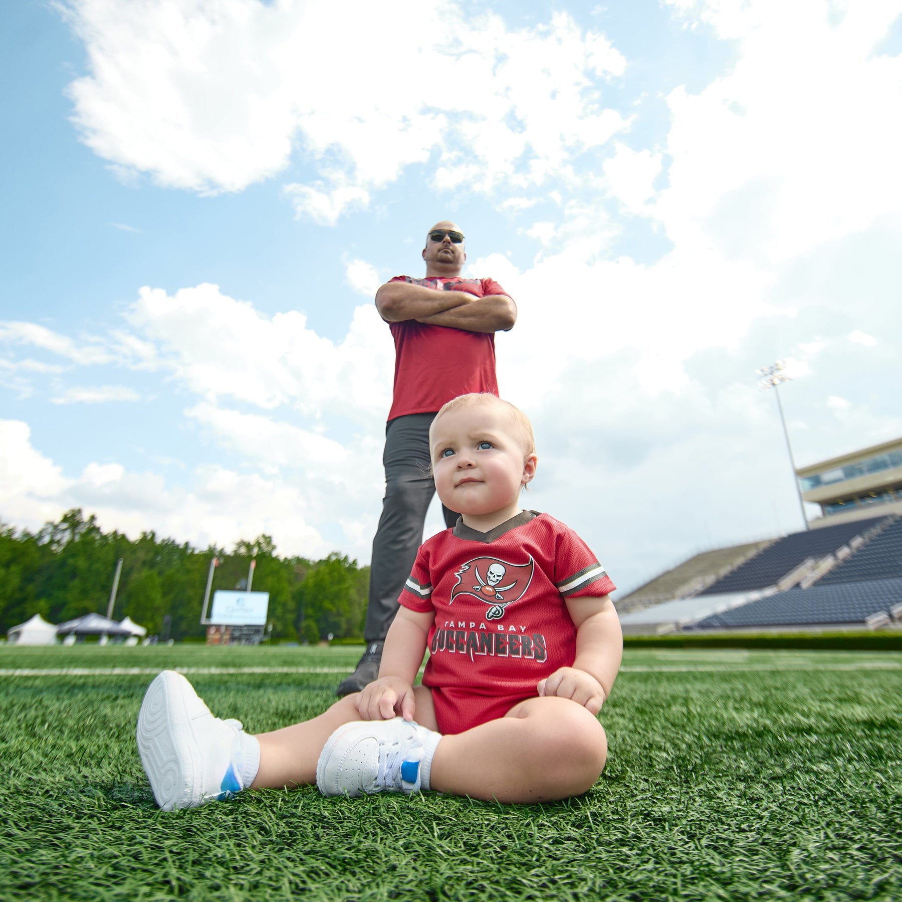This officially licensed NFL bodysuit is the perfect first Buccaneers “jersey” for your little one! The bodysuit features a V-neck with a shoulder placket to keep changes comfortable and quick. The bodysuit also features jersey numbers 00 on the back and a team logo front and center to show off your team pride. The bottom snaps are positioned for convenient diaper changes, so taking breaks from the game won’t last long. This bodysuit is a great choice for warm or cool game days, as it may be layered with shorts or a pair of joggers or worn all on its own. Available in Tampa Bay Buccaneers infant sizes.