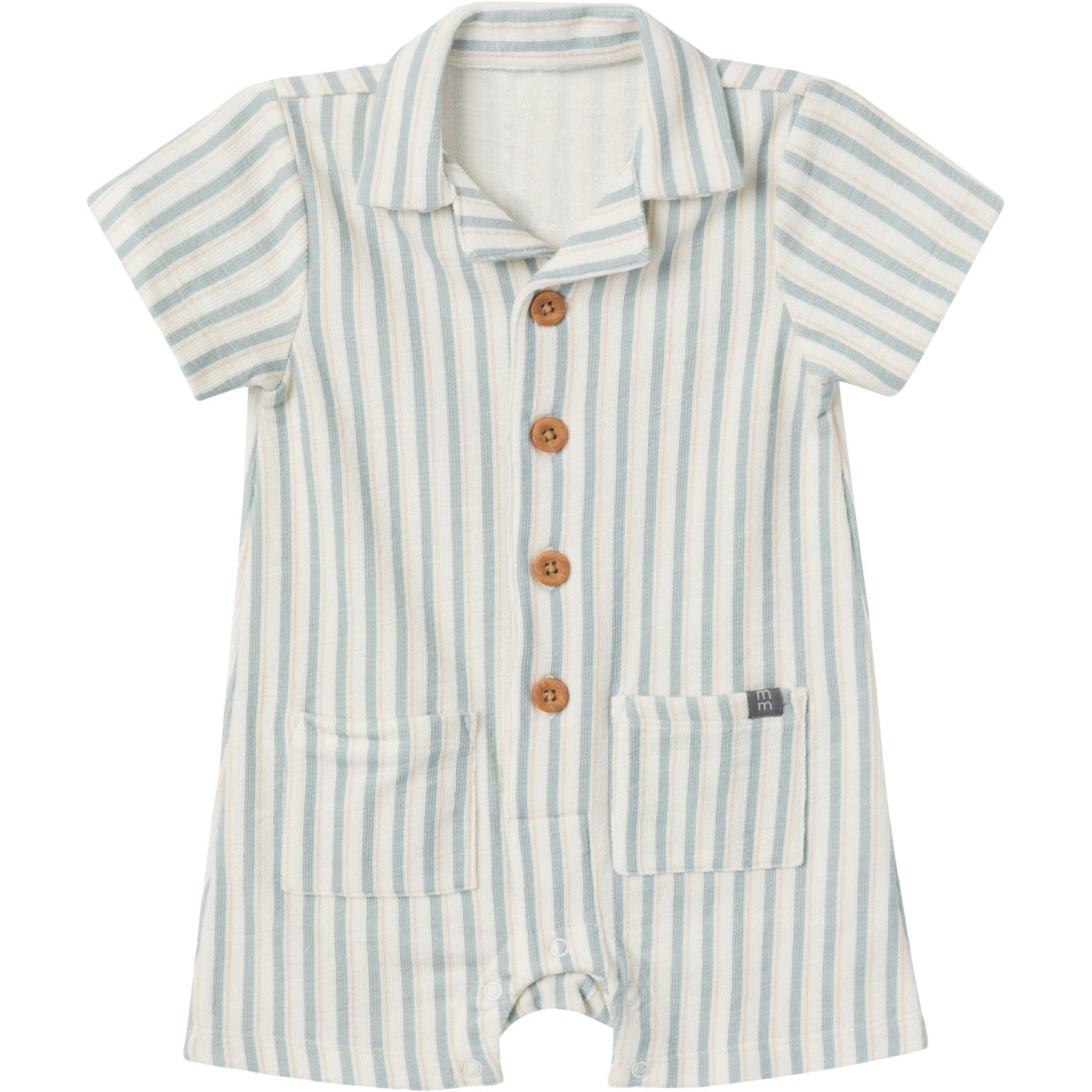 Get your baby boy ready for sunny days in this charming ivory romper with teal stripes! Crafted from 100% cotton, it’s not only soft on his sensitive skin but also durable and breathable, ideal for warm weather adventures. The leg snaps make diaper changes quick and easy, while the cute collar and faux wood buttons down the front add a dash of sophistication to his everyday look. Whether he’s out exploring or just relaxing, this romper combines comfort with style, so your little guy will be ready to take on the day in the cutest way possible! Our essentials have been independently certified with STANDARD 100 by OEKO-TEX® so that you don’t have to worry about harmful substances in your baby’s wardrobe. Pack includes one romper.