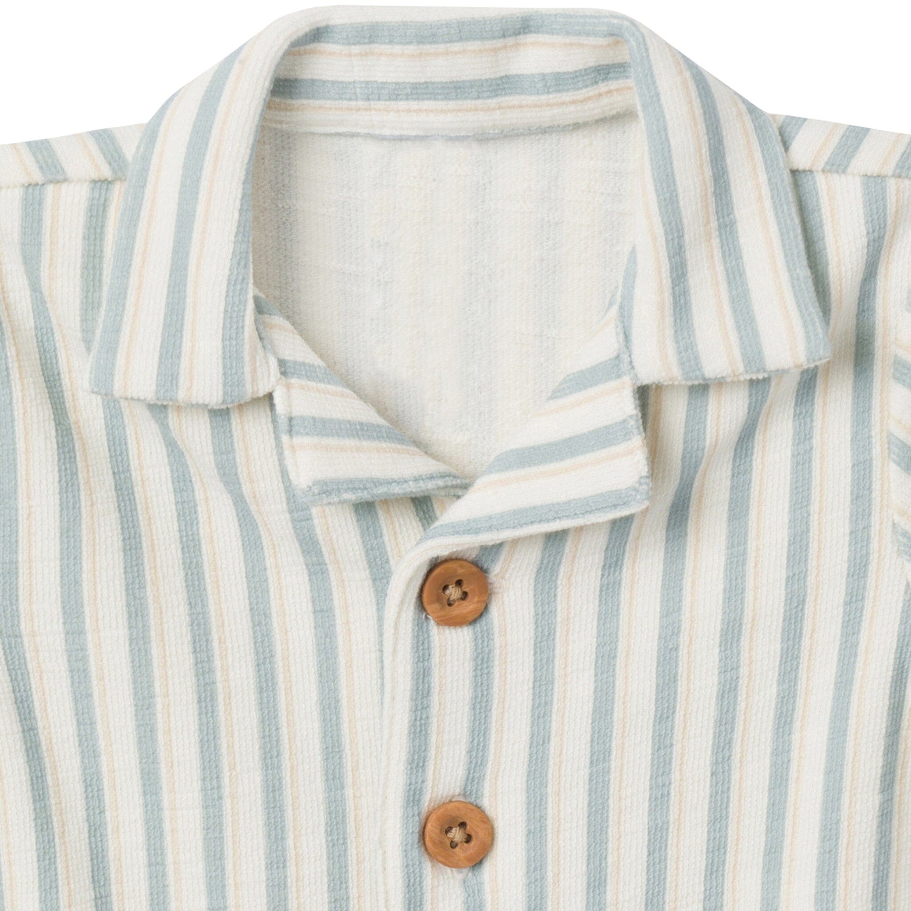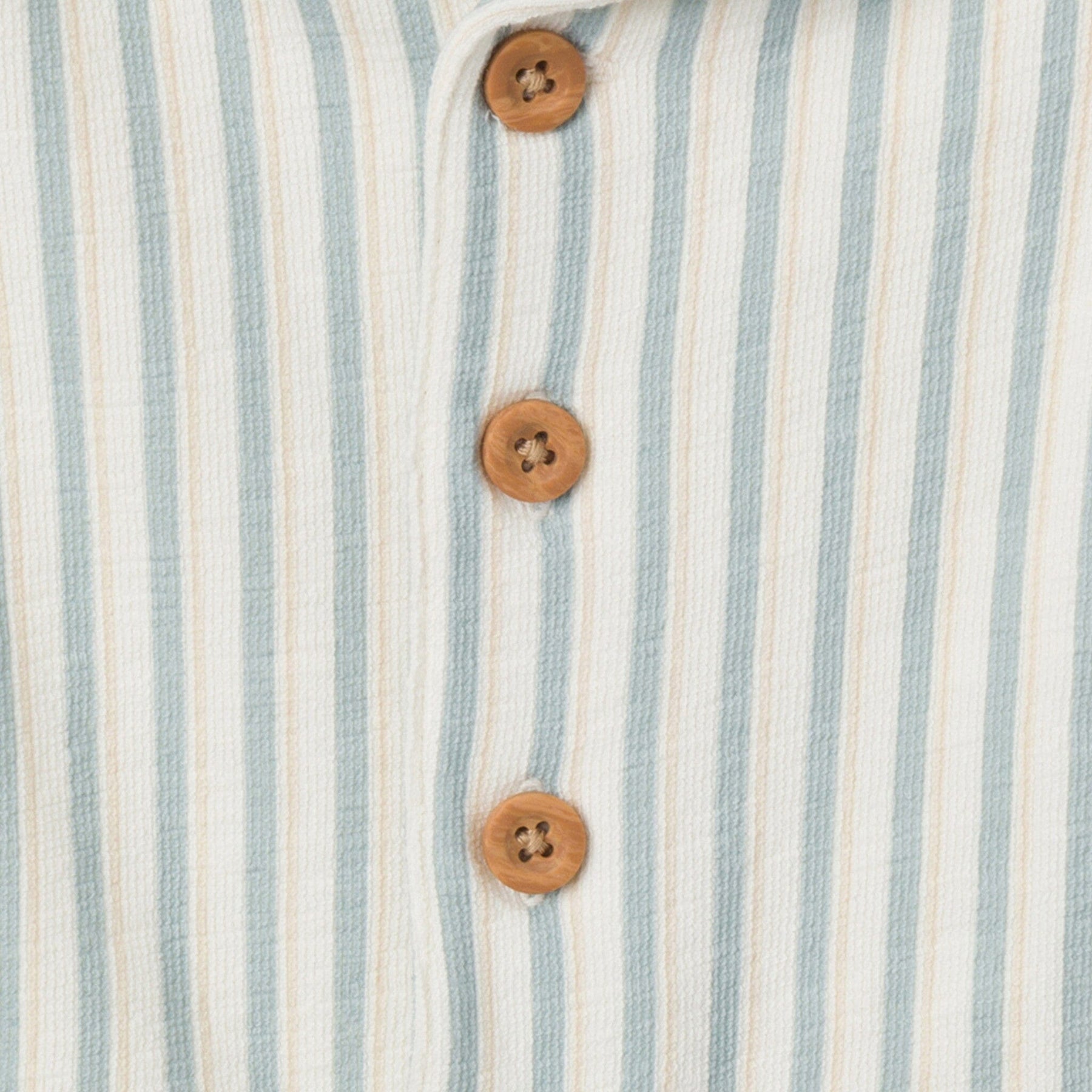 • Ivory with teal stripes, faux wood buttons down front