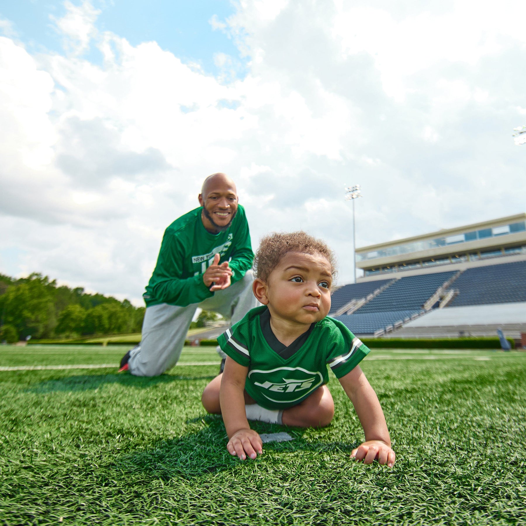 This officially licensed NFL bodysuit is the perfect first Jets “jersey” for your little one! Your will stay comfy throughout the entire game (and day!) in the polyester mesh fabric of this NFL bodysuit. The bodysuit features a V-neck with a shoulder placket to keep changes comfortable and quick. The bodysuit also features jersey numbers on the back and a team logo front and center to show off ’s team pride. The bottom snaps are positioned for convenient diaper changes, so taking breaks from the game won’t last long. This boys’ bodysuit is a great choice for warm or cool game days, as it may be layered over or worn all on its own. This bodysuit is machine washable for your convenience.