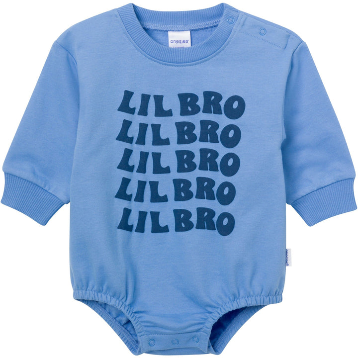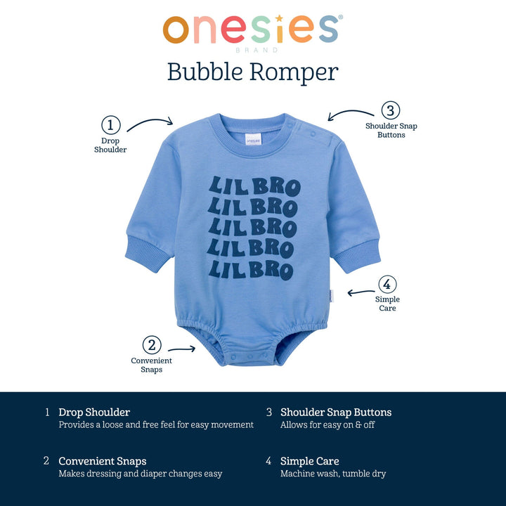 Cool days call for warm cuddles with this sweatshirt bubble romper! Made from soft, cozy fabric, it’s perfect for keeping your little guy comfy on chilly days. Flexible ribbing at the neckline, wrists, and leg openings means he can wiggle, roll, and kick to his heart’s content, while shoulder placket snaps make getting dressed easy. The light blue color with bold “Lil Bro” lettering is too cute to handle! Our essentials have been independently certified with STANDARD 100 by OEKO-TEX® so that you don’t have to worry about harmful substances in your baby’s wardrobe. Includes one baby boy sweatshirt bubble romper.