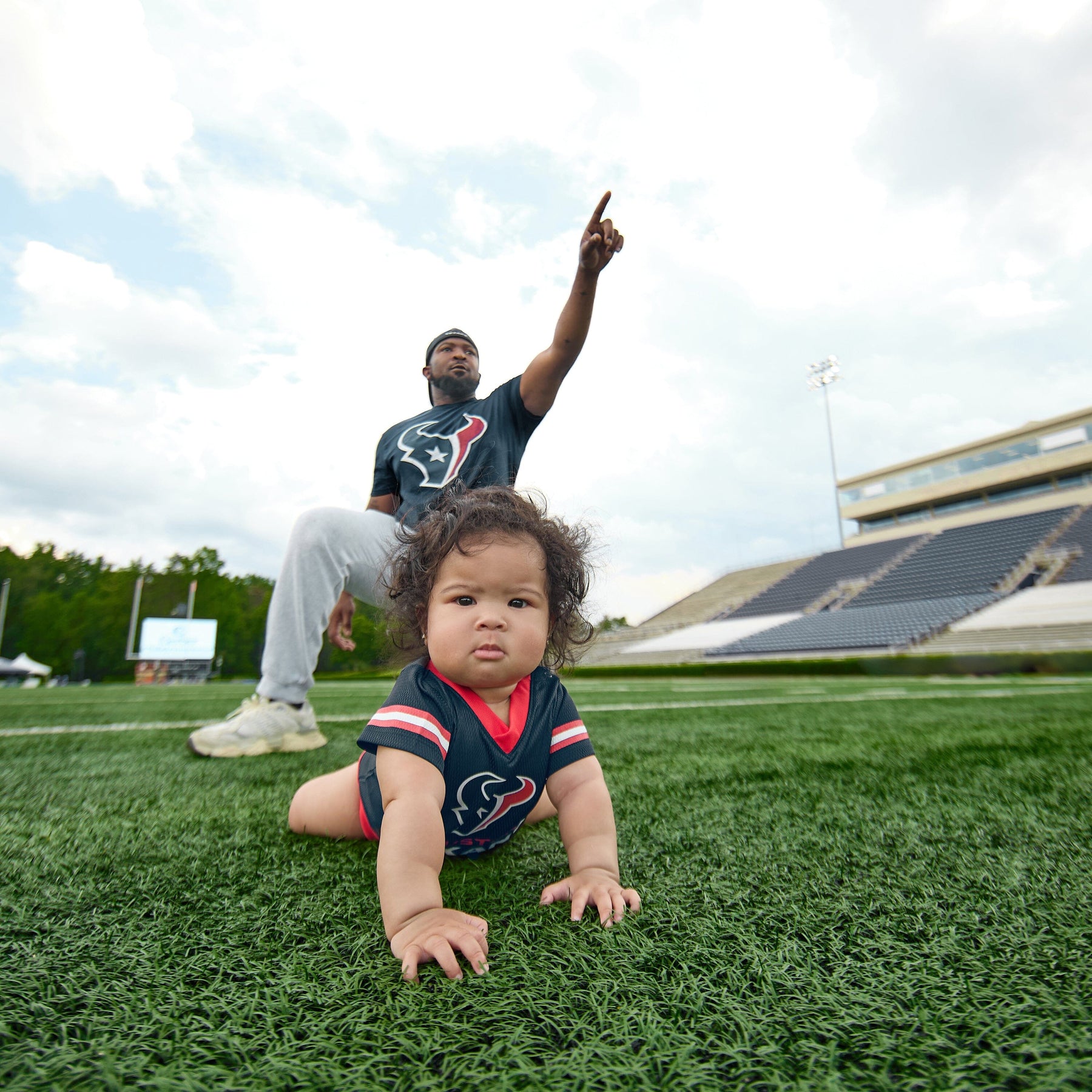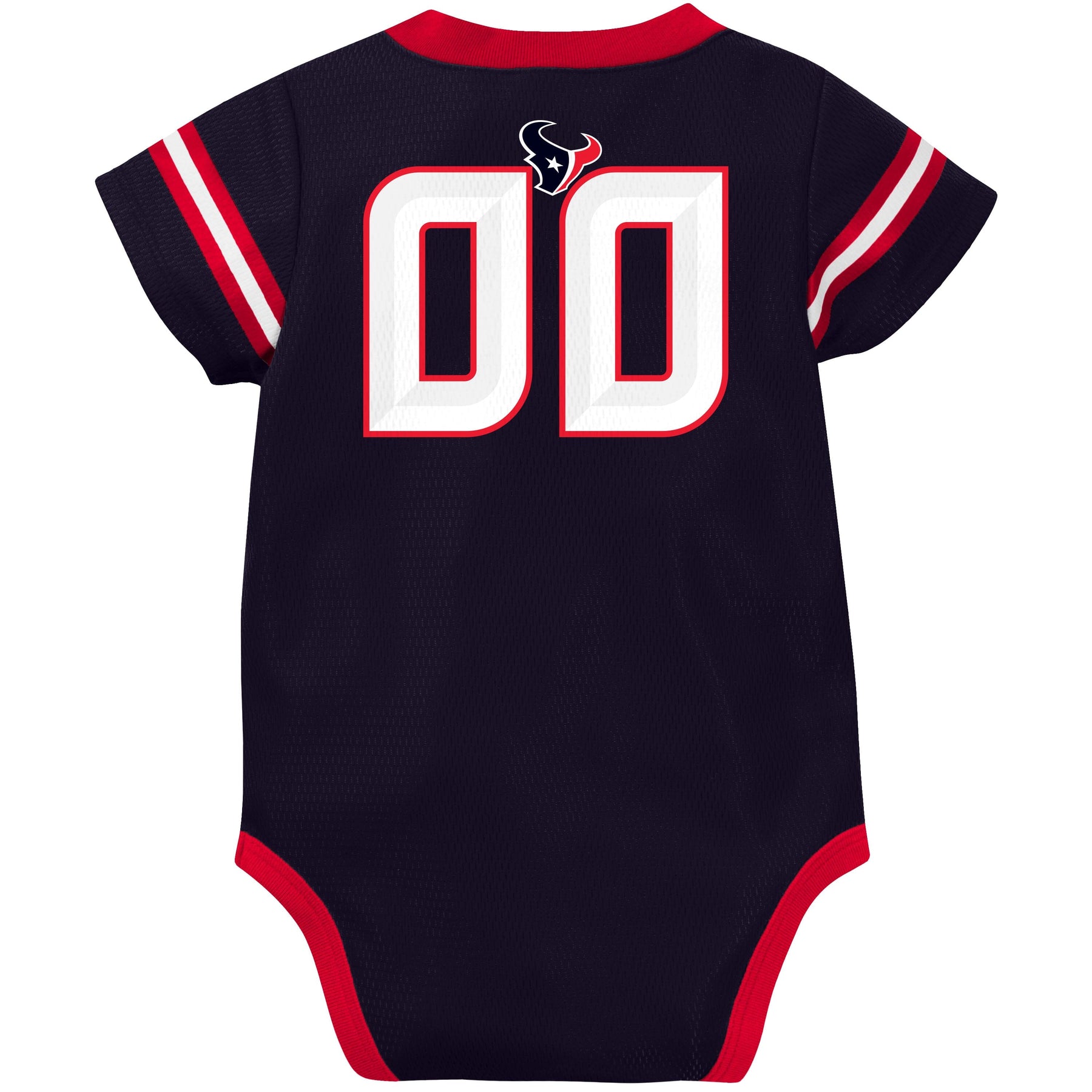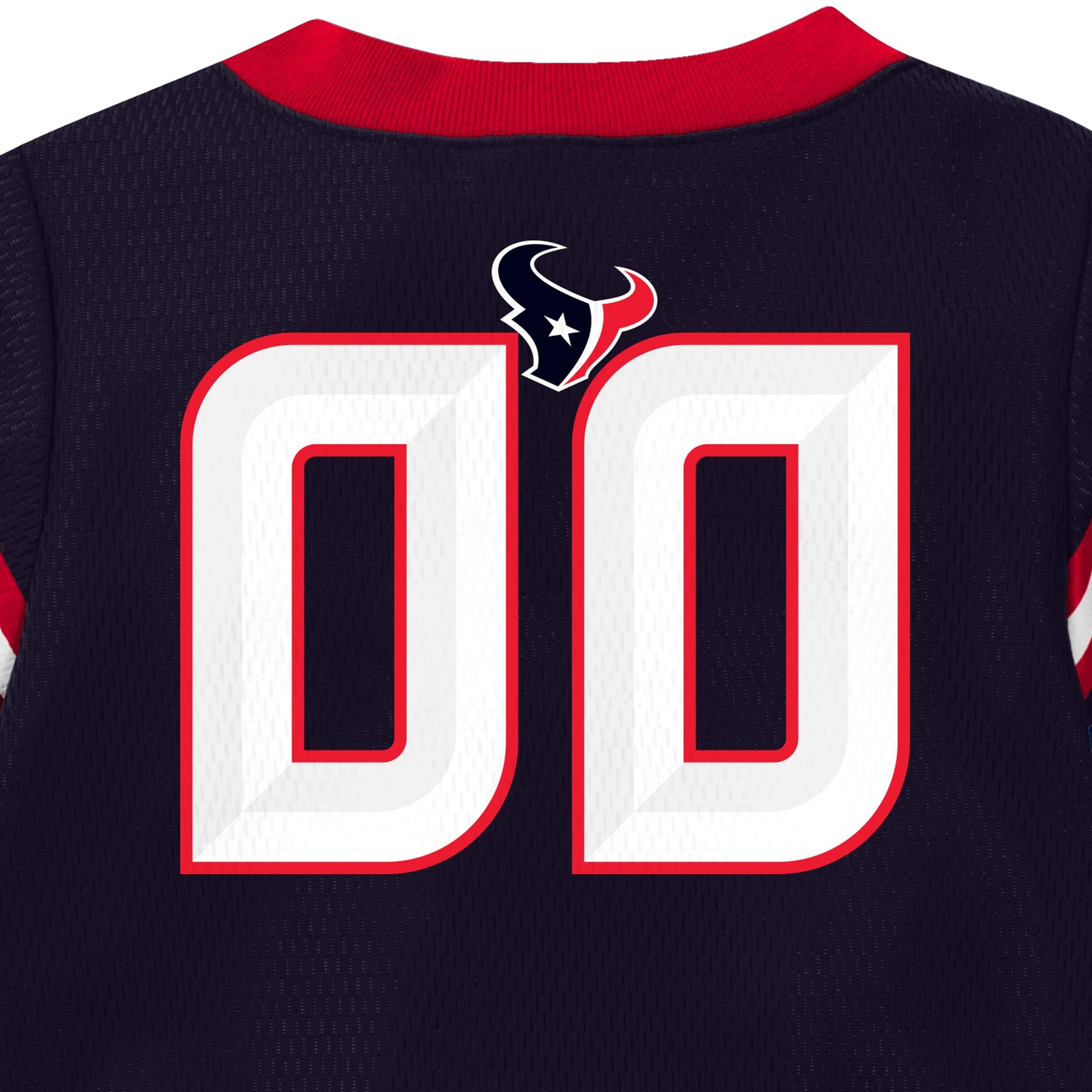 This officially licensed NFL bodysuit is the perfect first Texans “jersey” for your little one! Your will stay comfy throughout the entire game (and day!) in the polyester mesh fabric of this NFL bodysuit. The bodysuit features a V-neck with a shoulder placket to keep changes comfortable and quick. The bodysuit also features jersey numbers on the back and a team logo front and center to show off ’s team pride. The bottom snaps are positioned for convenient diaper changes, so taking breaks from the game won’t last long. This boys’ bodysuit is a great choice for warm or cool game days, as it may be layered over or worn all on its own. This bodysuit is machine washable for your convenience.