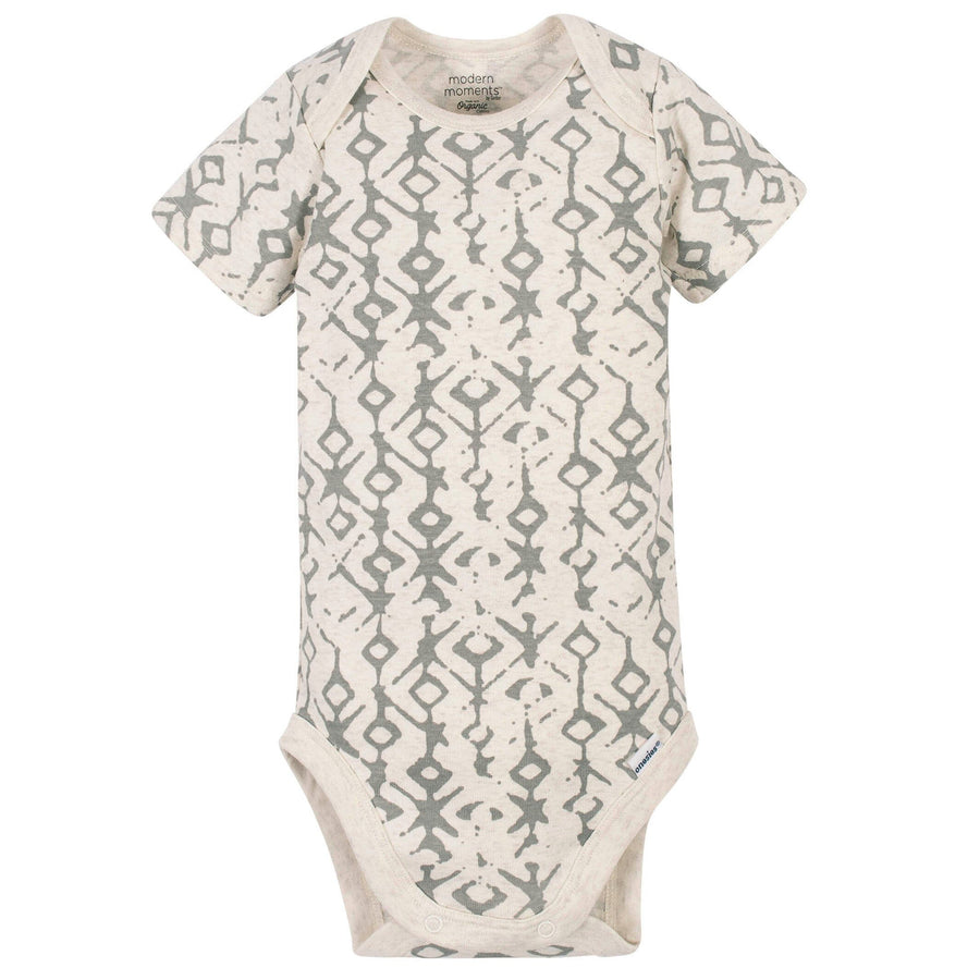 Modern Moments by Gerber®. Modern sophistication made with the quality and value you expect from us. Add a modern flair to your baby’s wardrobe with our stylish and practical ivory and gray tribal print organic Onesies® Brand bodysuit. This baby outfit features an expandable lap shoulder neckline and high-positioned bottoms snaps for easier changes. It’s perfect for layering and is comfortable for all-day wear. We had this bodysuit independently certified with STANDARD 100 by OEKO-TEX® so that you don’t have to worry about substances in your baby’s clothing. The soft fabric is made with cotton with organic fibers to make for a healthy planet and happy baby. This bodysuit’s simple style will add something special to any of baby’s outfits. Create a fun, mix-it-up look by pairing this bodysuit with our Modern Moments caps, coveralls, and bibs. This bodysuit is machine washable and dryable and is made with 97% cotton with organic fibers and 3% spandex.