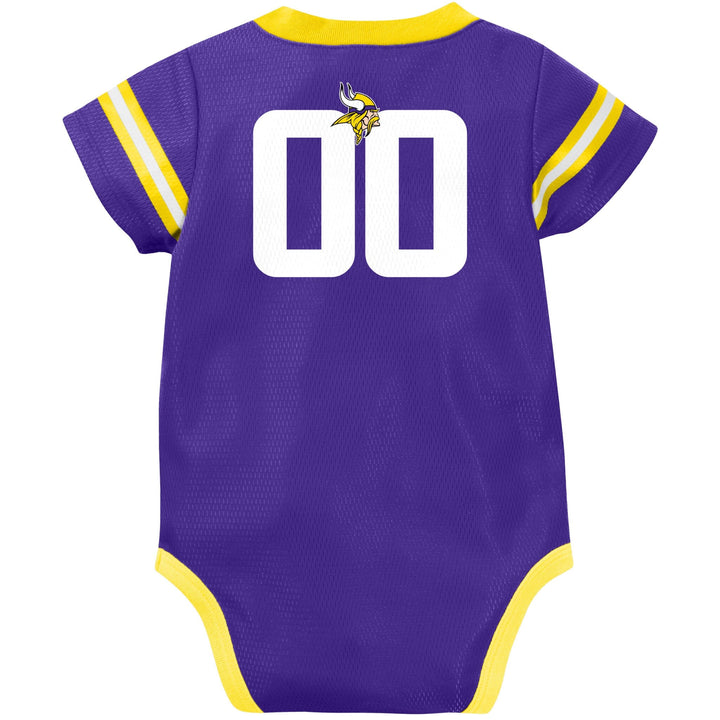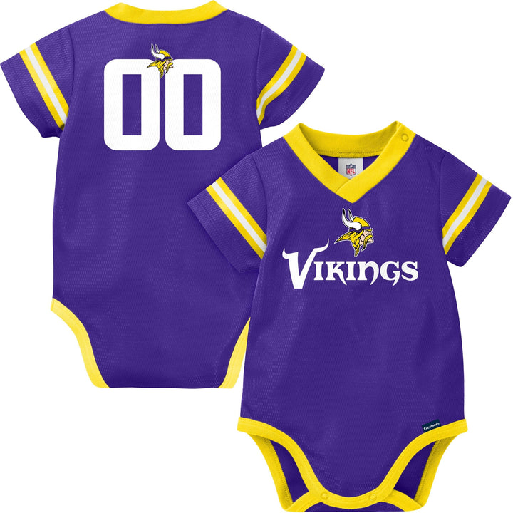 This officially licensed NFL bodysuit is the perfect first Vikings “jersey” for your little one! Your will stay comfy throughout the entire game (and day!) in the polyester mesh fabric of this NFL bodysuit. The bodysuit features a V-neck with a shoulder placket to keep changes comfortable and quick. The bodysuit also features jersey numbers on the back and a team logo front and center to show off ’s team pride. The bottom snaps are positioned for convenient diaper changes, so taking breaks from the game won’t last long. This boys’ bodysuit is a great choice for warm or cool game days, as it may be layered over or worn all on its own. This bodysuit is machine washable for your convenience.