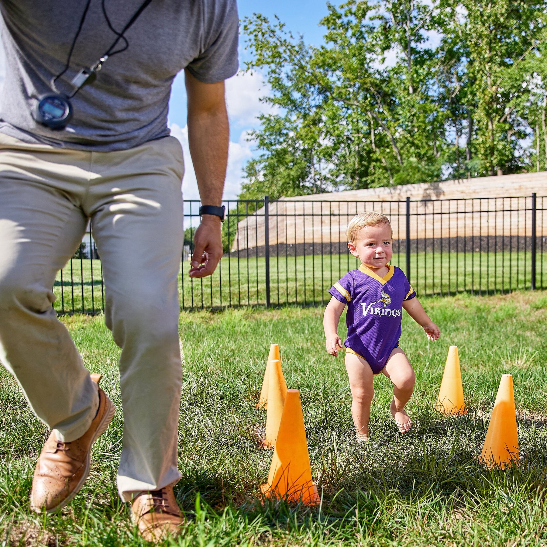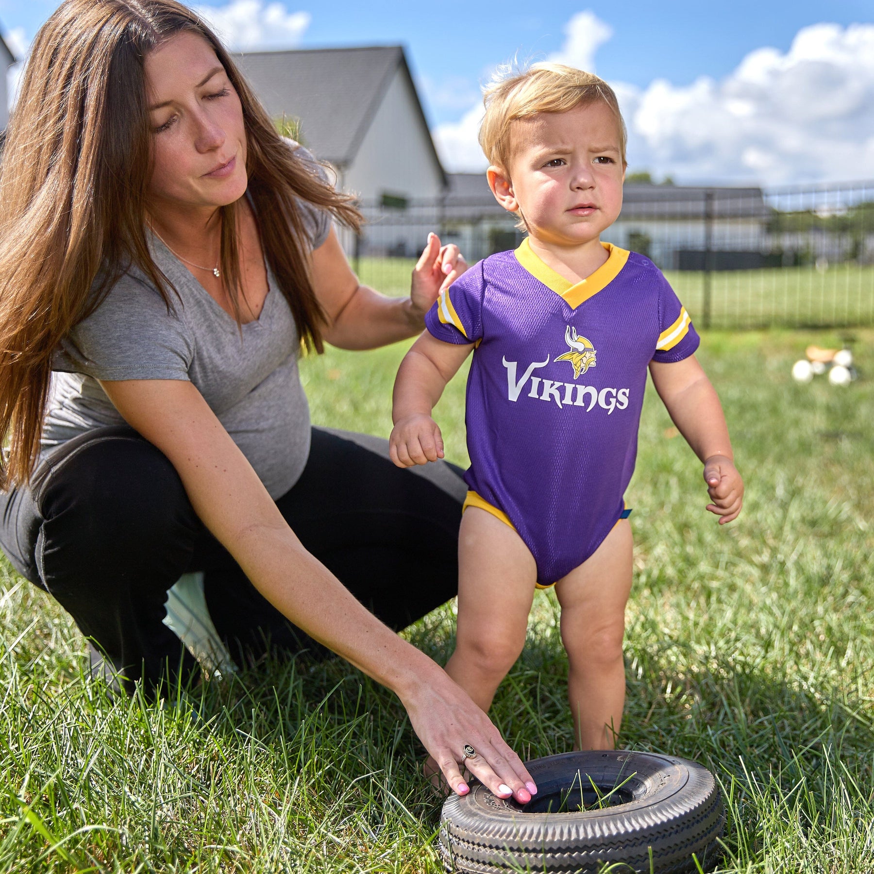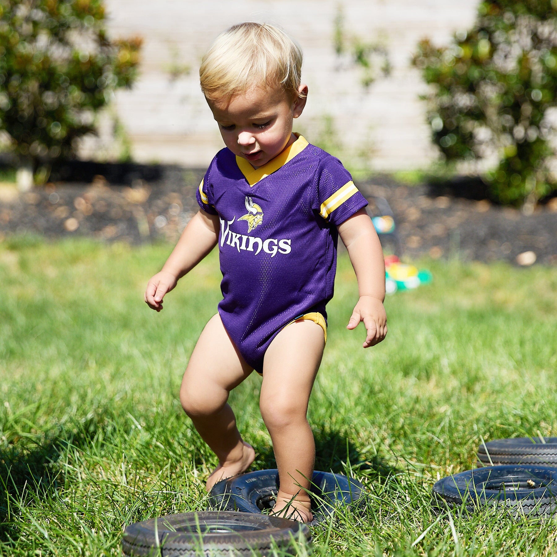 This officially licensed NFL bodysuit is the perfect first Vikings “jersey” for your little one! Your will stay comfy throughout the entire game (and day!) in the polyester mesh fabric of this NFL bodysuit. The bodysuit features a V-neck with a shoulder placket to keep changes comfortable and quick. The bodysuit also features jersey numbers on the back and a team logo front and center to show off ’s team pride. The bottom snaps are positioned for convenient diaper changes, so taking breaks from the game won’t last long. This boys’ bodysuit is a great choice for warm or cool game days, as it may be layered over or worn all on its own. This bodysuit is machine washable for your convenience.