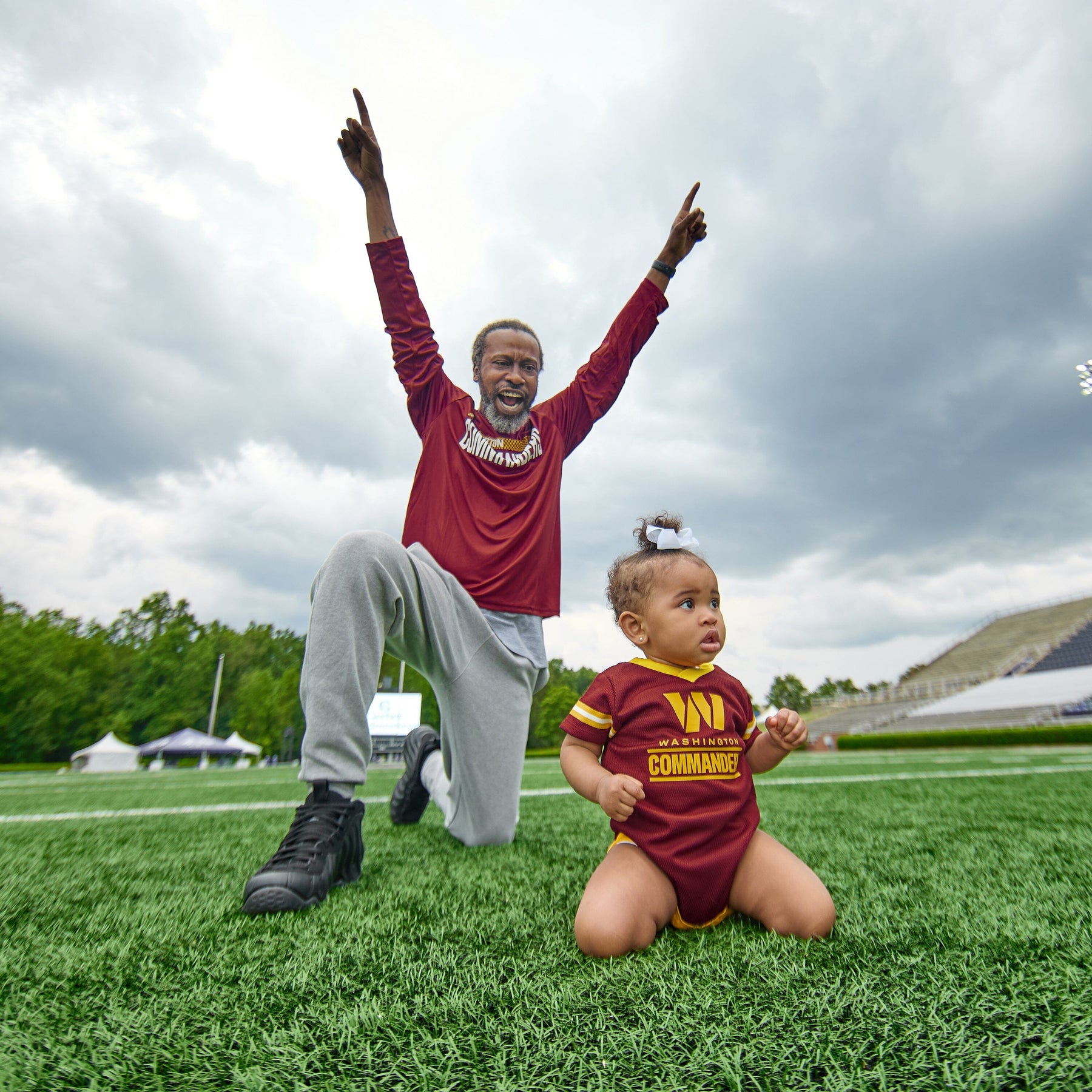 Get your little first round draft pick ready for the pros with this baby boys' officially licensed Washington Commanders short sleeve jersey bodysuit! The 100% poly dazzle mesh and rib fabrics provide a cool, breathable feel. The Commanders logo is on proud display. Game day fun is guaranteed with this creative piece. Handy design features like the higher-in-the-front bottom snap closure makes diaper changes less work. Dressing him out is easier with the expandable lap shoulder neckline. Just toss these easy care items into the machine washer and dryer for hassle-free post-game clean up!