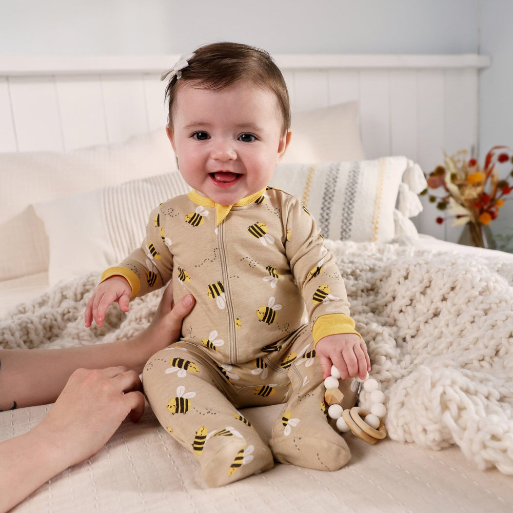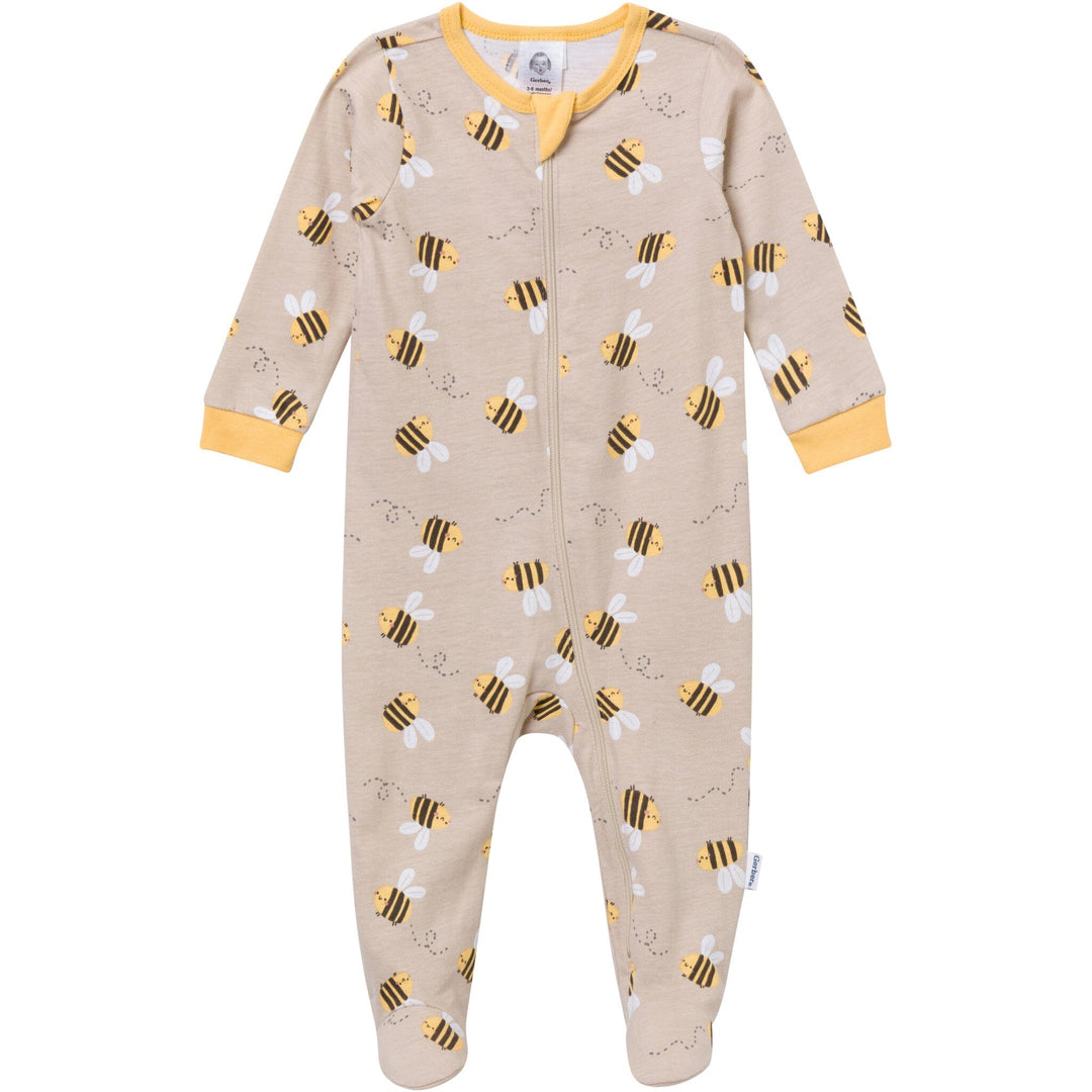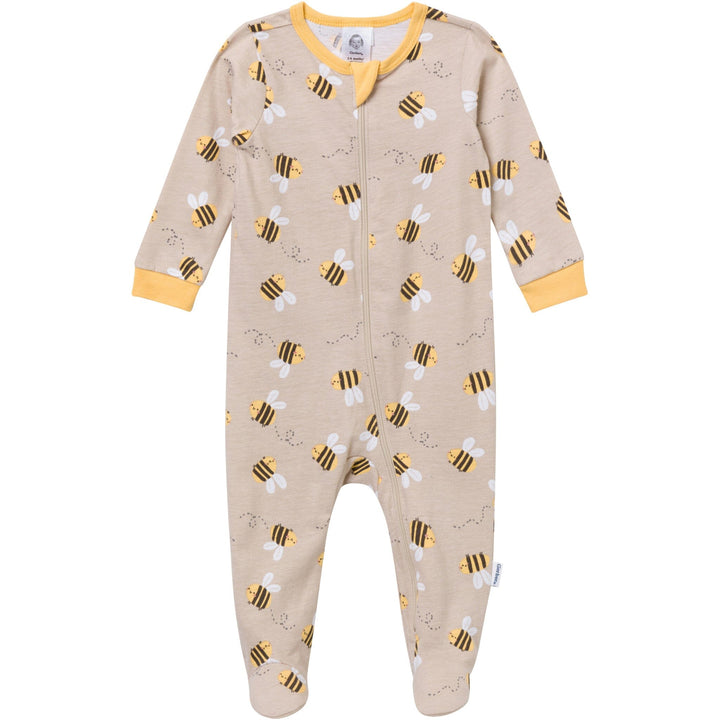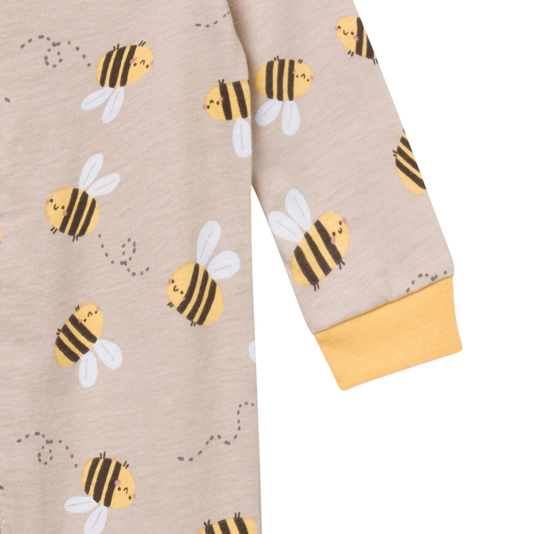 Sweet as can bee! This adorable Sleep 'N Play features a soft tan background, cheerful yellow trim, and a playful happy bee print that’s full of charm. Made from 100% cotton, it’s gentle on sensitive skin and perfect for all-day comfort. The footed design keeps those tiny toes warm, while the full-length zipper makes diaper changes quick and fuss-free. A rounded collar with a protective zipper tab helps prevent irritation, so your little honey stays cozy from playtime to bedtime. Cute, comfy, and absolutely buzzing with sweetness! Our essentials have been independently certified with STANDARD 100 by OEKO-TEX® so that you don’t have to worry about harmful substances in your little one's wardrobe. Includes one Sleep 'N Play.
