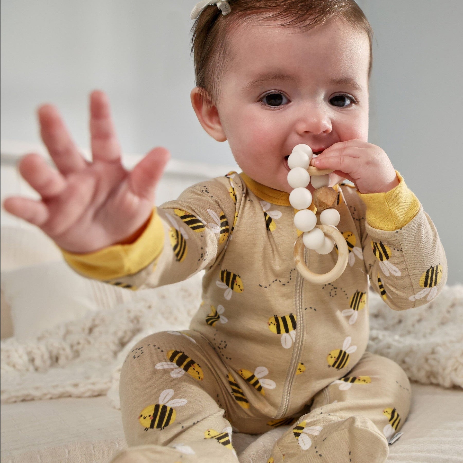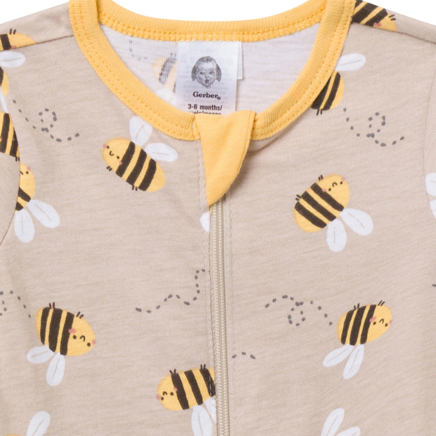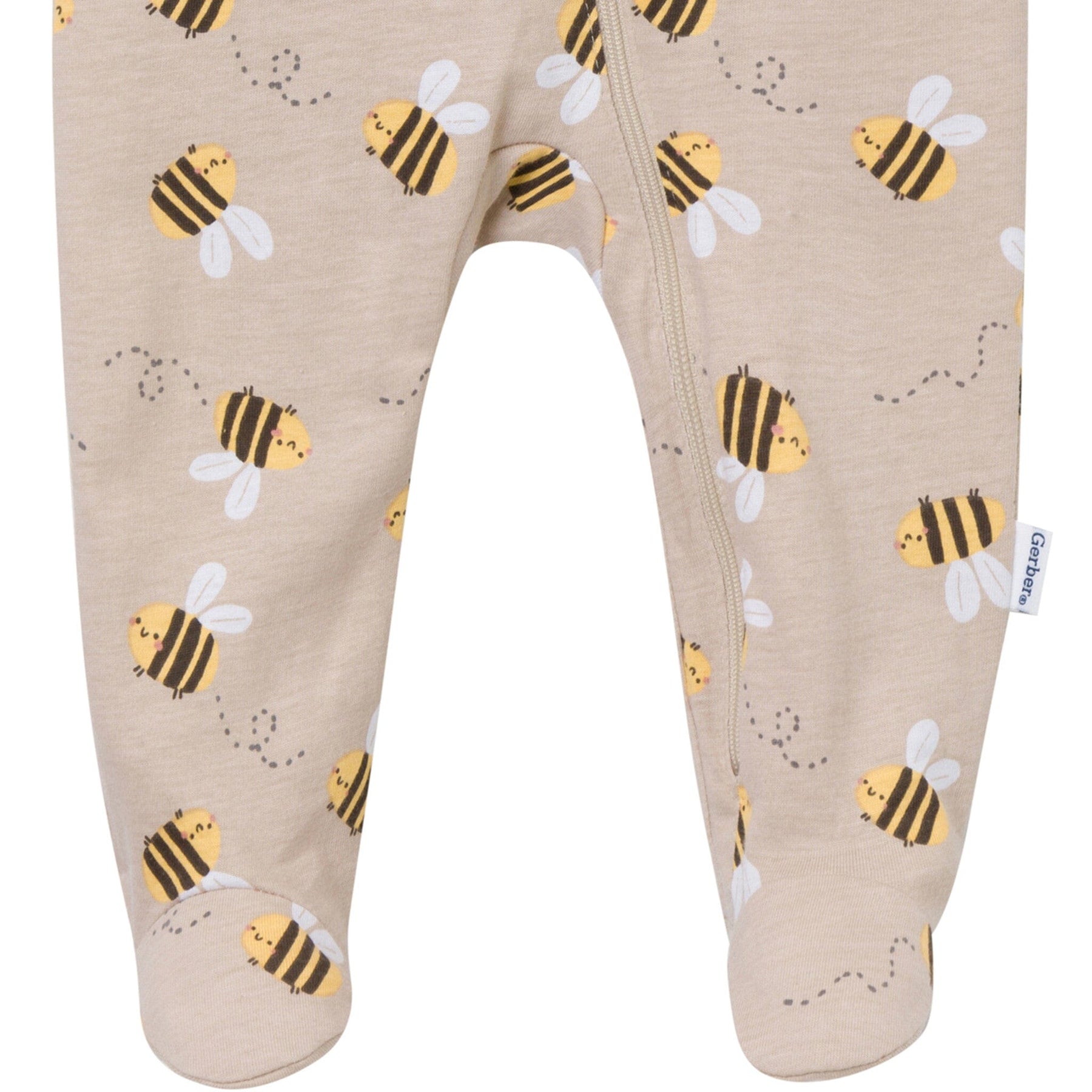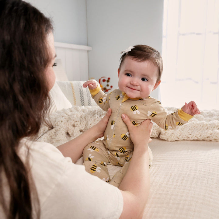 Sweet as can bee! This adorable Sleep 'N Play features a soft tan background, cheerful yellow trim, and a playful happy bee print that’s full of charm. Made from 100% cotton, it’s gentle on sensitive skin and perfect for all-day comfort. The footed design keeps those tiny toes warm, while the full-length zipper makes diaper changes quick and fuss-free. A rounded collar with a protective zipper tab helps prevent irritation, so your little honey stays cozy from playtime to bedtime. Cute, comfy, and absolutely buzzing with sweetness! Our essentials have been independently certified with STANDARD 100 by OEKO-TEX® so that you don’t have to worry about harmful substances in your little one's wardrobe. Includes one Sleep 'N Play.