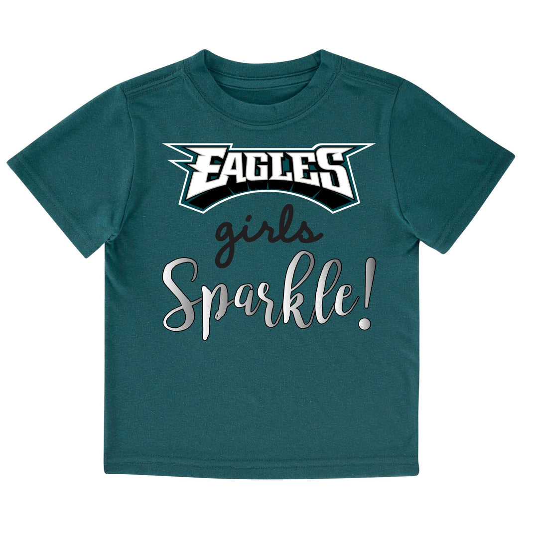 Get your little lady ready for the game with this officially licensed toddler girls’ Philadelphia Eagles short sleeve tee! The soft poly interlock fabric is soft/cotton, safe, and easy to clean! She’ll look great sporting this easy-to-clean tee in her team’s colors with the Eagles team logo on the front.