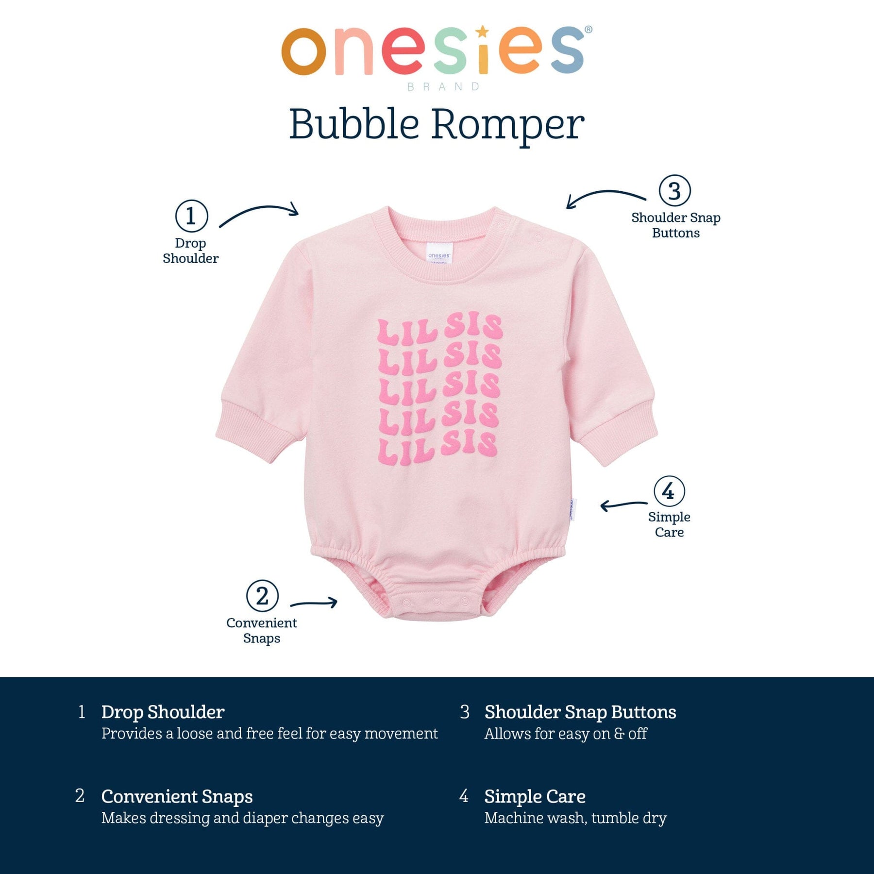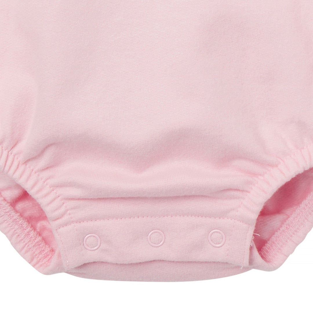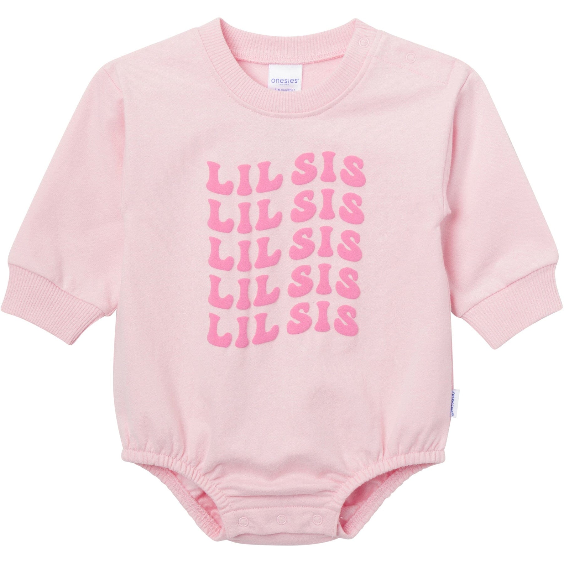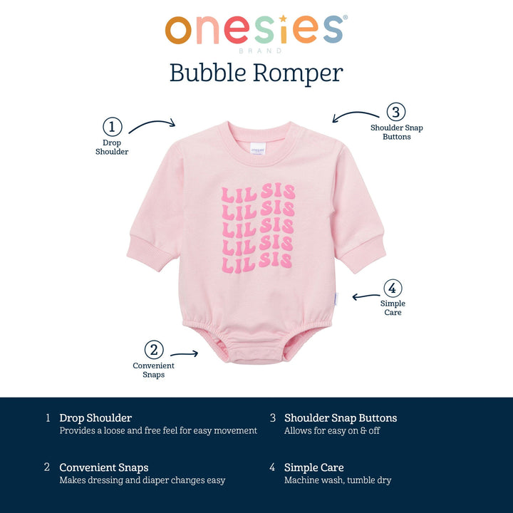 “Lil Sis” is ready to shine in this snuggly bubble romper! Made with soft, sweatshirt-style fabric that’s perfect for cooler days, this outfit wraps her in cozy comfort while giving her room to move with flexible ribbing at the neckline, wrists, and leg openings. Shoulder placket snaps add a practical touch for easy dressing. Light pink with bold dark pink “Lil Sis” lettering, this romper brings the warm fuzzies and big sister love all in one sweet package. Our essentials have been independently certified with STANDARD 100 by OEKO-TEX® so that you don’t have to worry about harmful substances in your baby’s wardrobe. Includes one baby girl sweatshirt bubble romper.