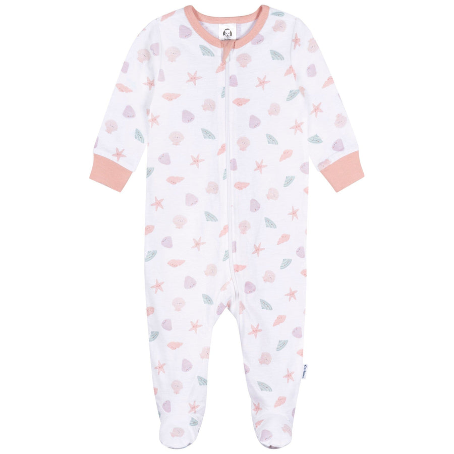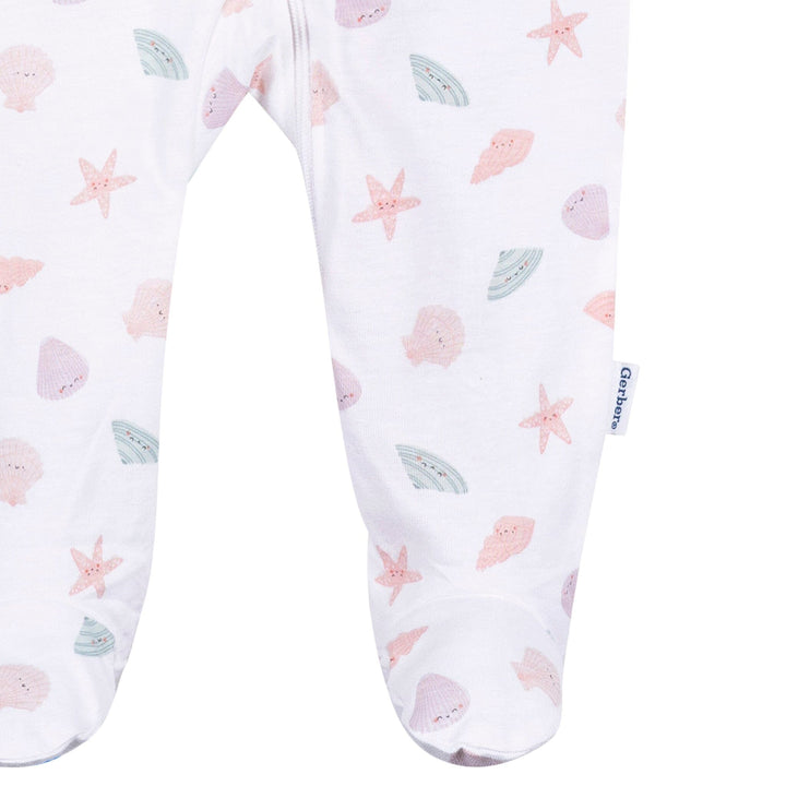 Dive into comfort with this adorable baby girl Sleep 'N Play, featuring a playful multi-color seashell print on crisp white fabric! Made from 100% cotton, it's soft and gentle on your baby's sensitive skin, making it perfect for all-day wear. The cozy, footed style keeps little toes warm during naptime or while exploring the world around her. A full-length zipper simplifies dressing and diaper changes, while the rounded neckline with a protective zipper guard ensures a snug and comfortable fit. Whether it's time to snooze or play, this Sleep 'N Play is a shore thing for style and versatility! Our essentials have been independently certified with STANDARD 100 by OEKO-TEX® so that you don't have to worry about harmful substances in your baby's wardrobe. This pack includes one Sleep 'N Play.