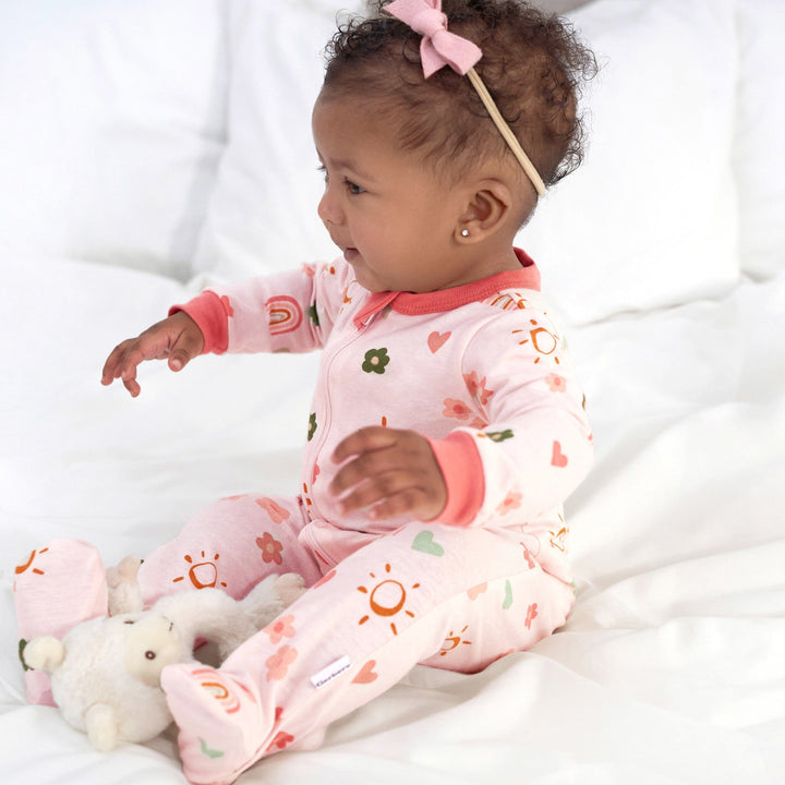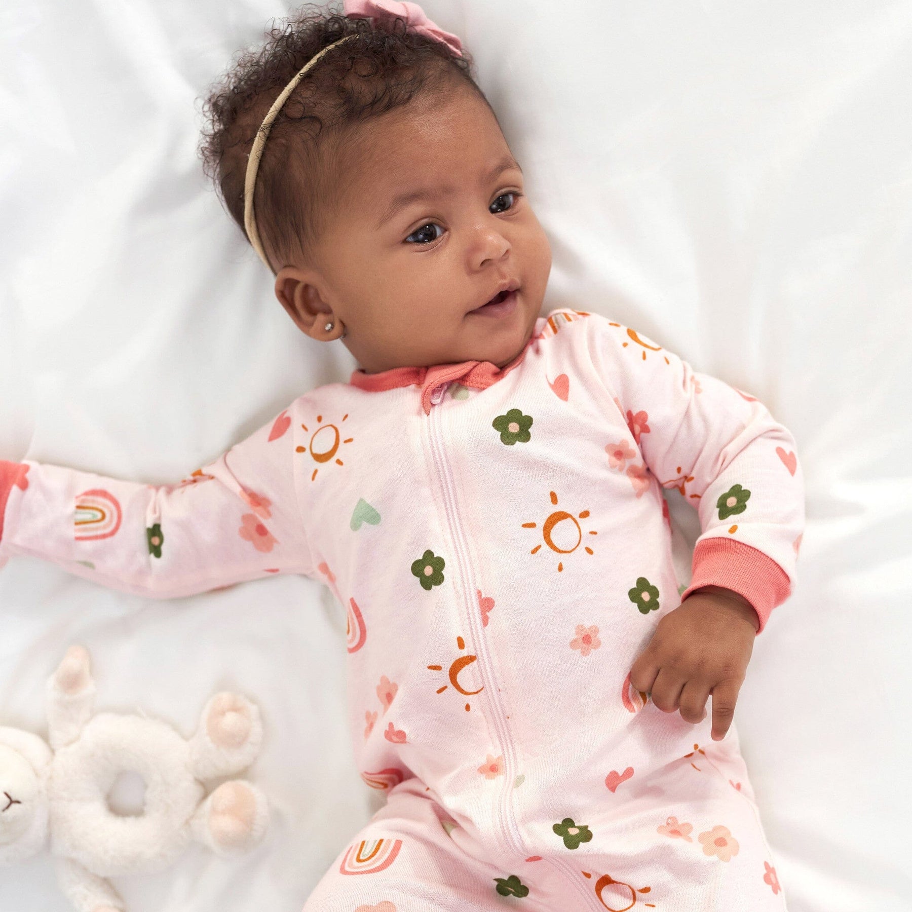 Cozy, cute, and ready for anything! This baby Sleep 'N Play is made from 100% cotton, so they’re soft and oh-so-gentle on your little one’s sensitive skin. The full-length zipper makes those quick changes a breeze, even when it’s the middle of the night, and the footed design keeps those tiny toes warm and snuggly. Perfect for naptime, playtime, and every sweet moment in between, these one-pieces are a baby essential! Our essentials have been independently certified with STANDARD 100 by OEKO-TEX® so that you don’t have to worry about harmful substances in your little one's wardrobe. Includes one Sunshine & Rainbow Sleep 'N Play.