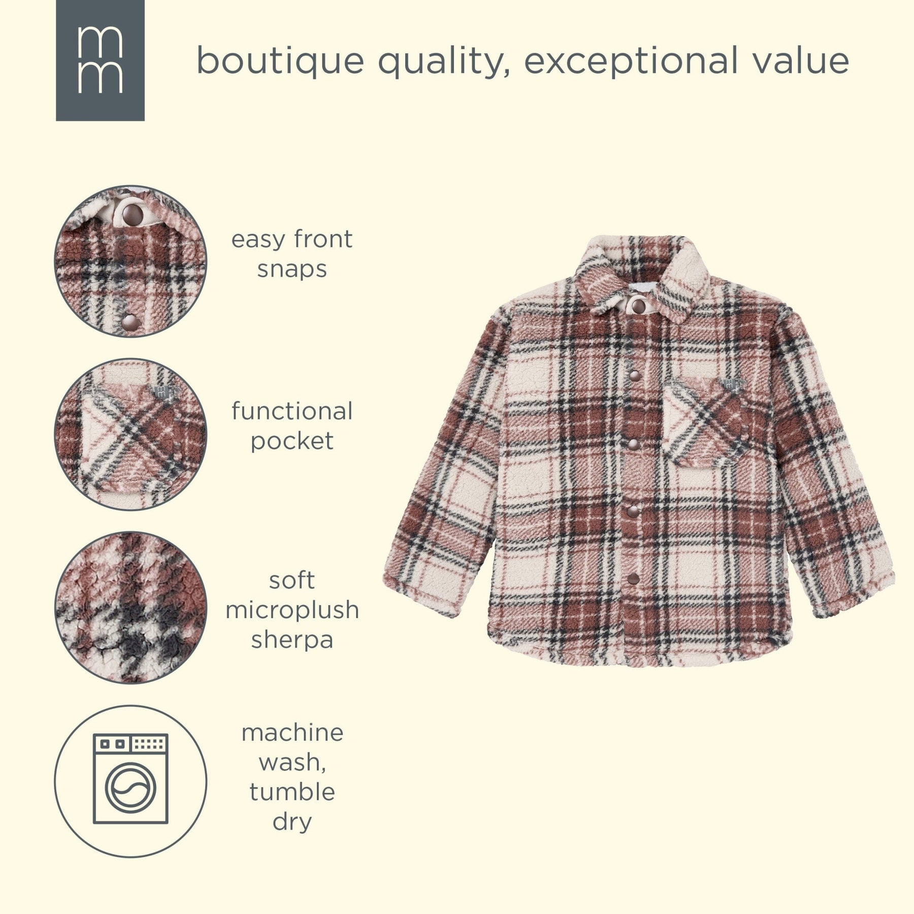 Wrap your little one in cozy style with this boy shacket, crafted from plush microplush fabric and finished with a textured sherpa outer layer. Designed for everyday wear, it offers warmth without restricting movement, making it ideal for outdoor adventures or layering indoors. The fashionable collar and front pocket add elevated detail, while the easy snap closures make quick changes a breeze. A versatile layer that adds a boutique-inspired feel to any outfit. Our essentials have been independently certified with STANDARD 100 by OEKO-TEX® so that you don’t have to worry about harmful substances in your little one's wardrobe. Pack includes one sherpa jacket from modern moments™ by Gerber®.