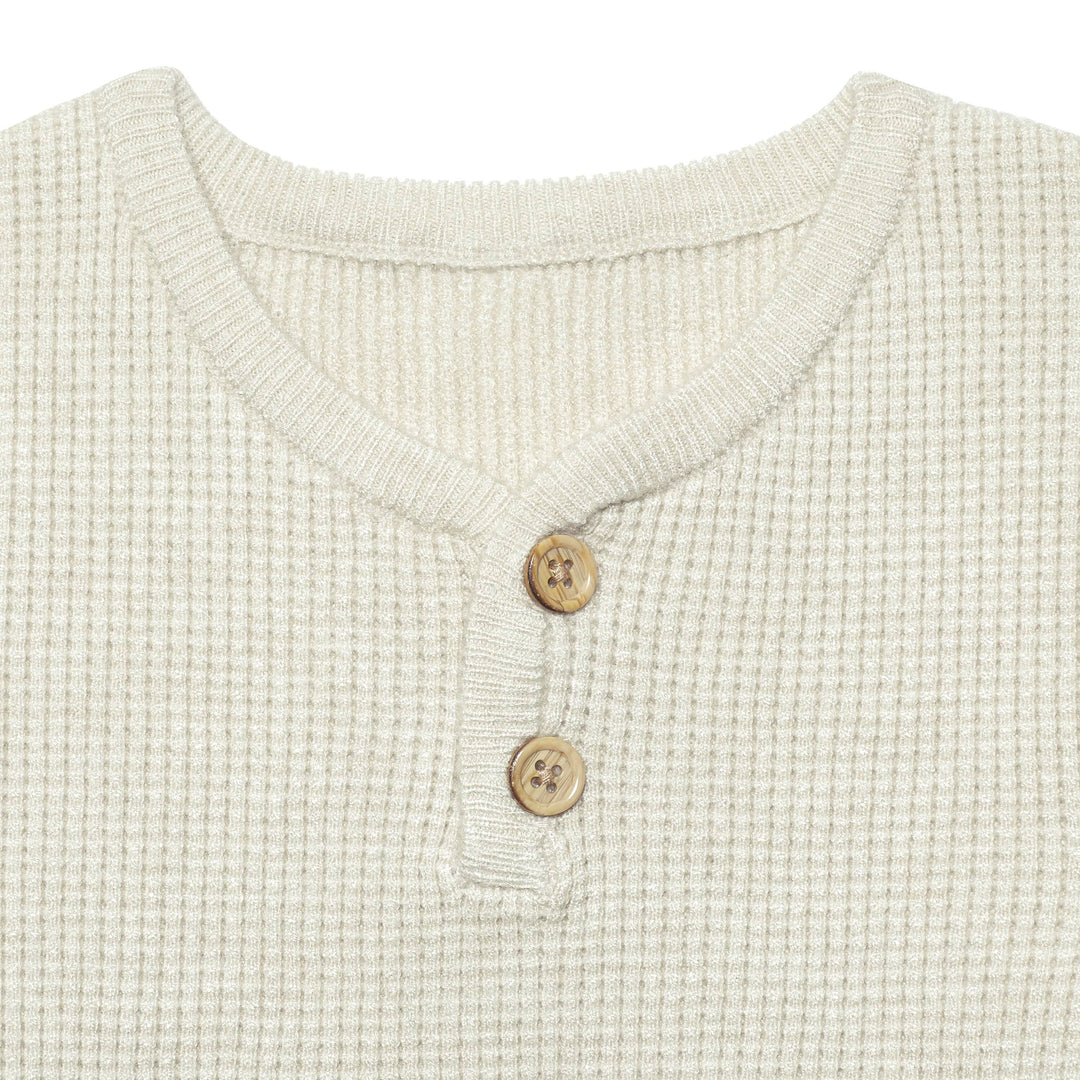 • Features a comfortable & casual crew neck with adorable faux wooden buttons at the center. Perfect to dress up or dress down. Mix & match with our coordinating boys' canvas pants & boys' joggers. Designed for easy changing, a perfect time-saver for parents & simple for toddlers' learning to dress themselves.