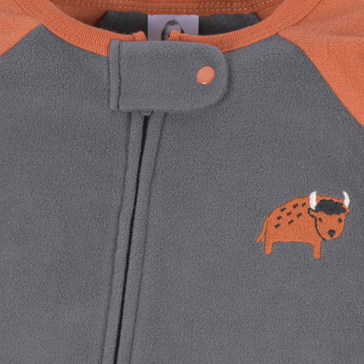 • Made with flame-resistant polyester microfleece to keep your little one safe all night long. Features long sleeves, footed legs & comfortable crew necks. May be layered underneath with our Onesies® bodysuitsSizes 0-3M - 24M feature a safety tab atop the zipper to prevent poking. All larger sizes do not.