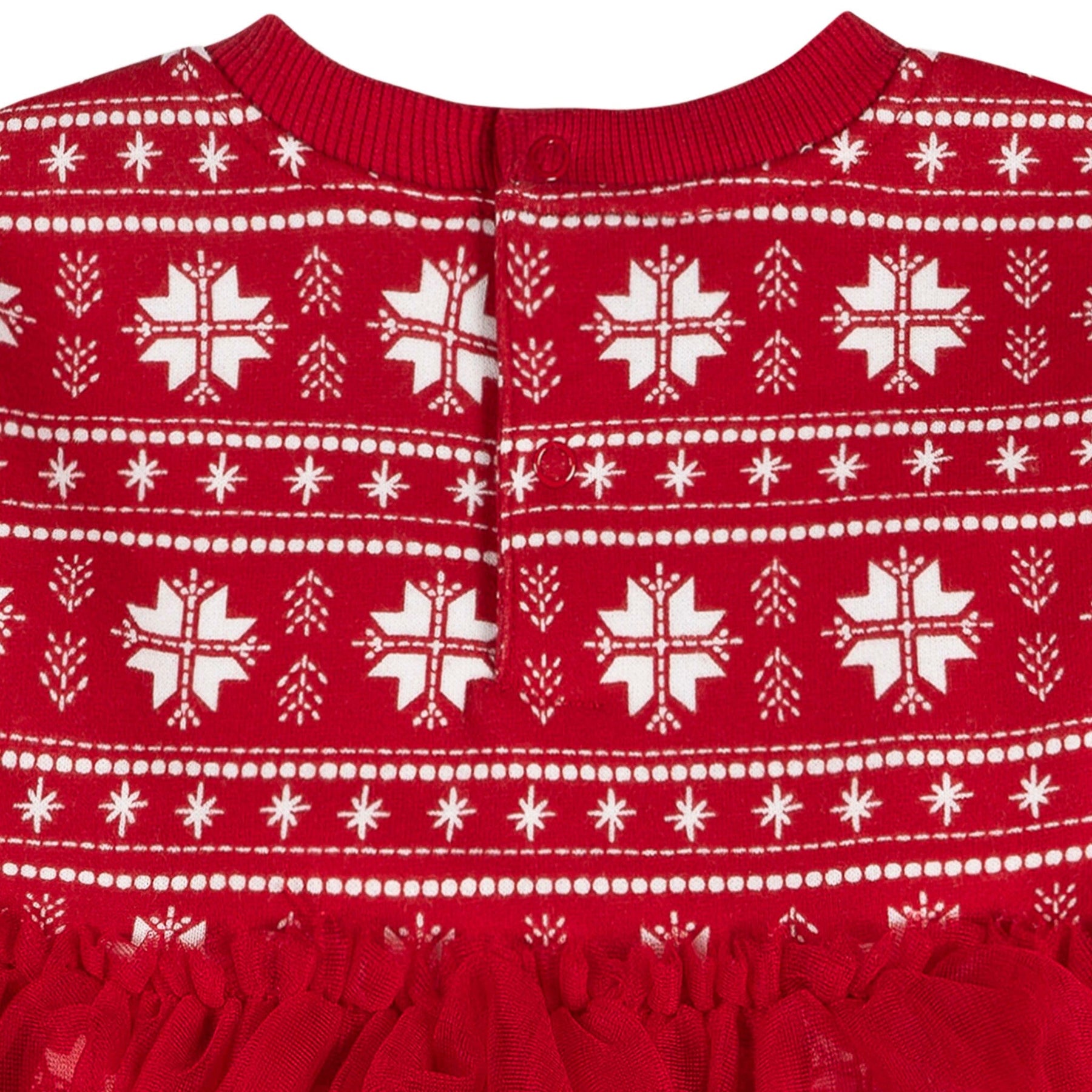 Get little ones ready for holiday fun with this festive dress! Made from soft, stretchy fabric, it keeps them comfy while they play and celebrate. The ribbed neckline and wrists add flexibility, and the drop-shoulder design gives a relaxed fit. Snaps at the back of the neck make dressing quick and easy, while the flowy tulle skirt adds a magical touch. Featuring a charming red color with white snowflakes, this dress is perfect for holiday photos, family gatherings, and making winter memories. Our essentials have been independently certified with STANDARD 100 by OEKO-TEX® so that you don’t have to worry about harmful substances in your little one’s wardrobe. Includes one dress.
