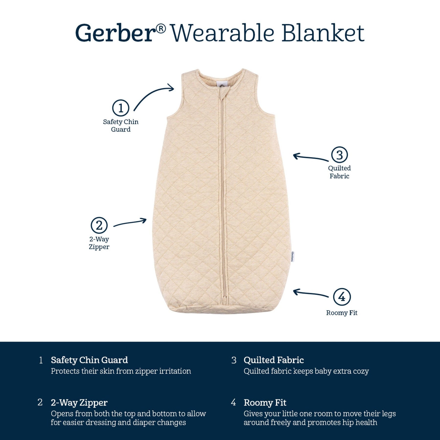 Our baby wearable blanket combines comfort and convenience to keep your little one cozy all night long. The two-way zipper makes it easy to put on and take off, simplifying nighttime diaper changes, while the neckline zipper protector ensures comfort and safety. With 2-ply thickness for extra warmth and a sleeveless design to reduce the risk of overheating, our wearable blanket is a favorite for parents and babies alike, ensuring baby’s sleep time comfort. Our essentials have been independently certified with STANDARD 100 by OEKO-TEX® so that you don’t have to worry about harmful substances in your baby’s wardrobe. Pack includes one wearable blanket.