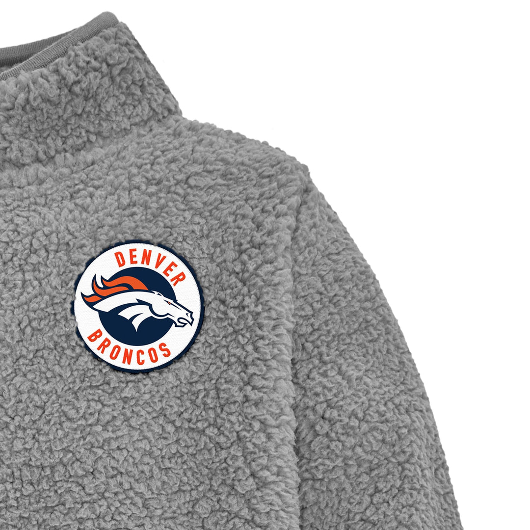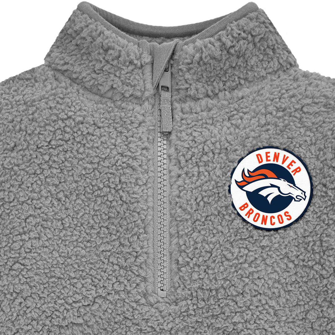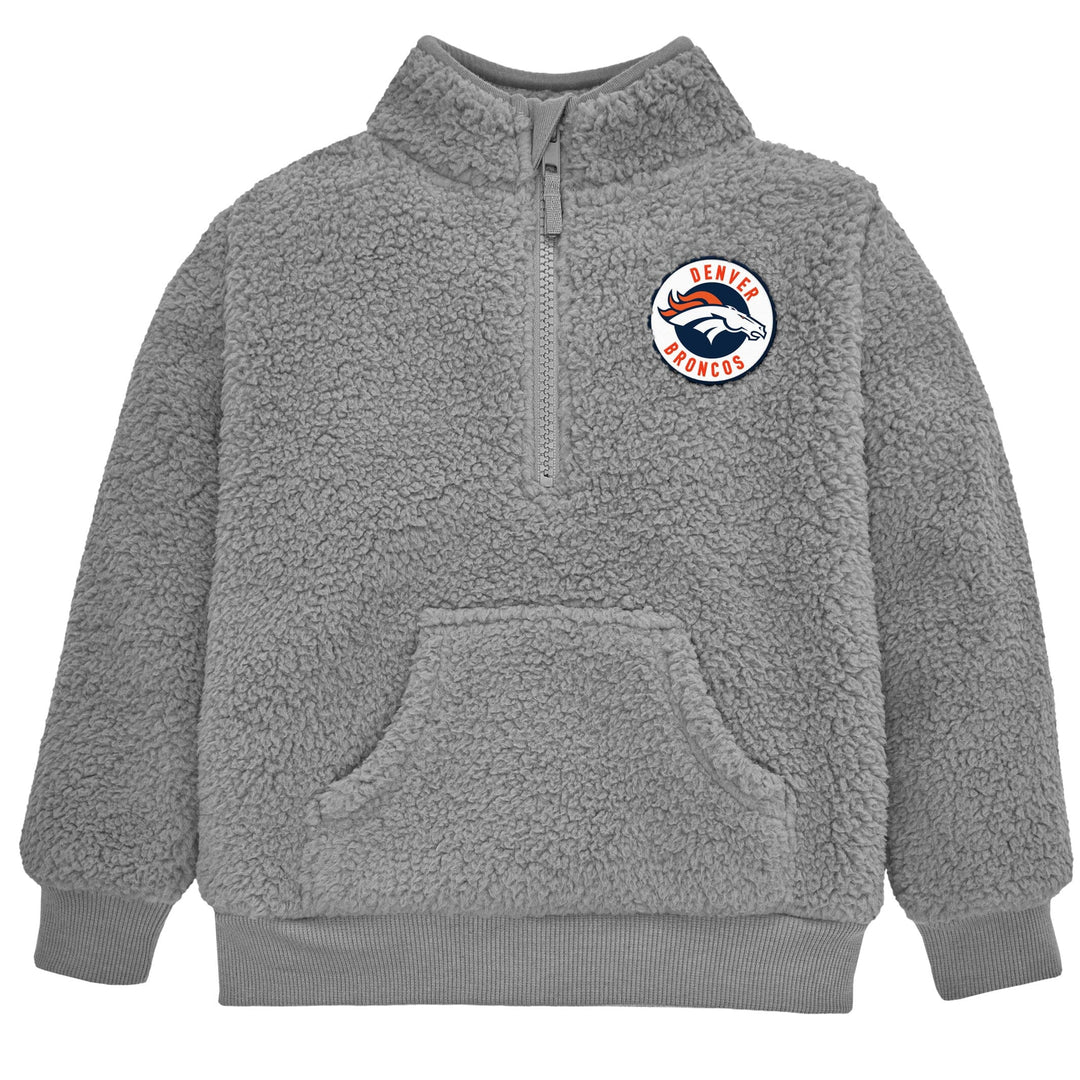 Your little one will be ready to cheer for their team with this comfy officially licensed Denver Broncos 1/4 Zip Sherpa Top. The top features a quarter zip neckline for easy on and off and the sherpa body is made to keep your little one comfortable throughout the entirety of the game (and the whole day long!). Featuring an embroidered team logo patch, cuffed sleeves and banded bottom, this is the perfect top for your little Broncos fan on cool game days, as it may be worn comfortably all on its own or layered with a shirt for extra warmth. This infant and toddler quarter zip top is machine washable to take care of any game-time spills with the utmost ease and convenience. Our essentials have been independently certified with STANDARD 100 by OEKO-TEX so that you don’t have to worry about harmful substances in your little one's wardrobe. Includes one quarter zip top.