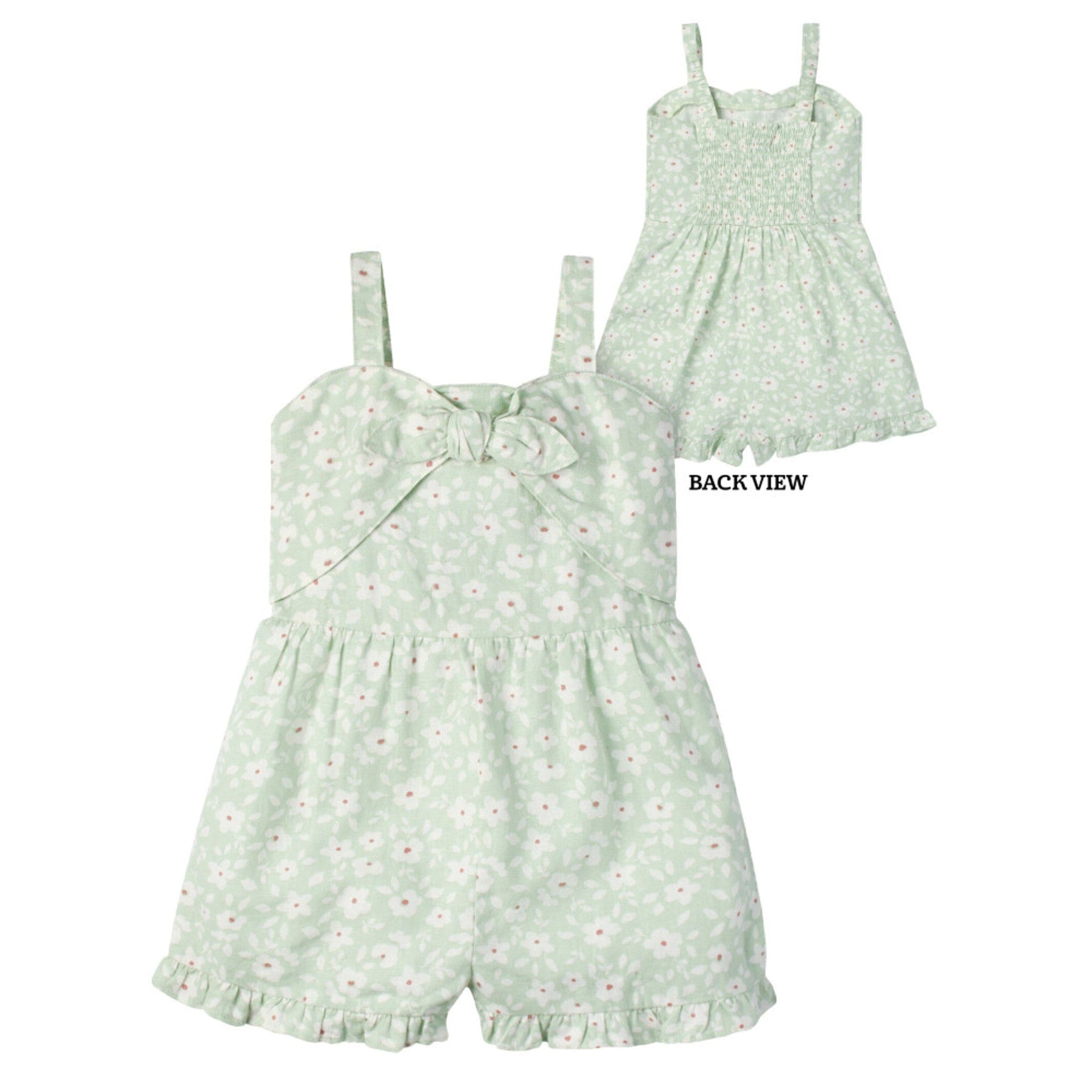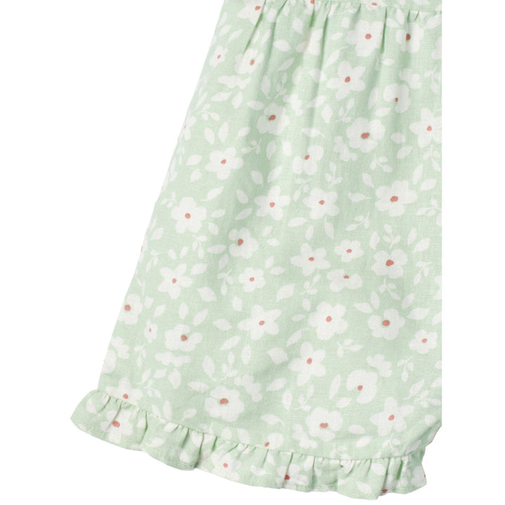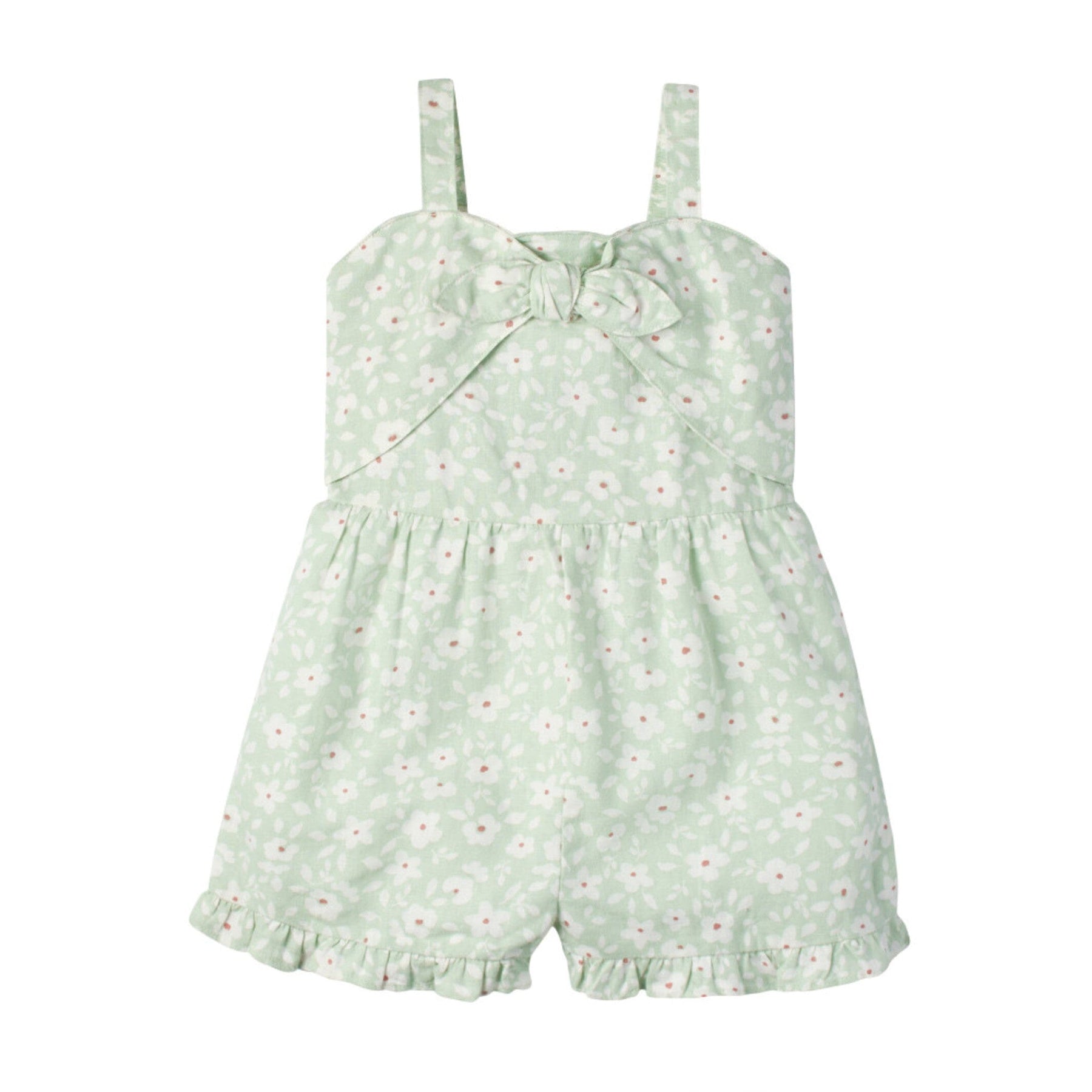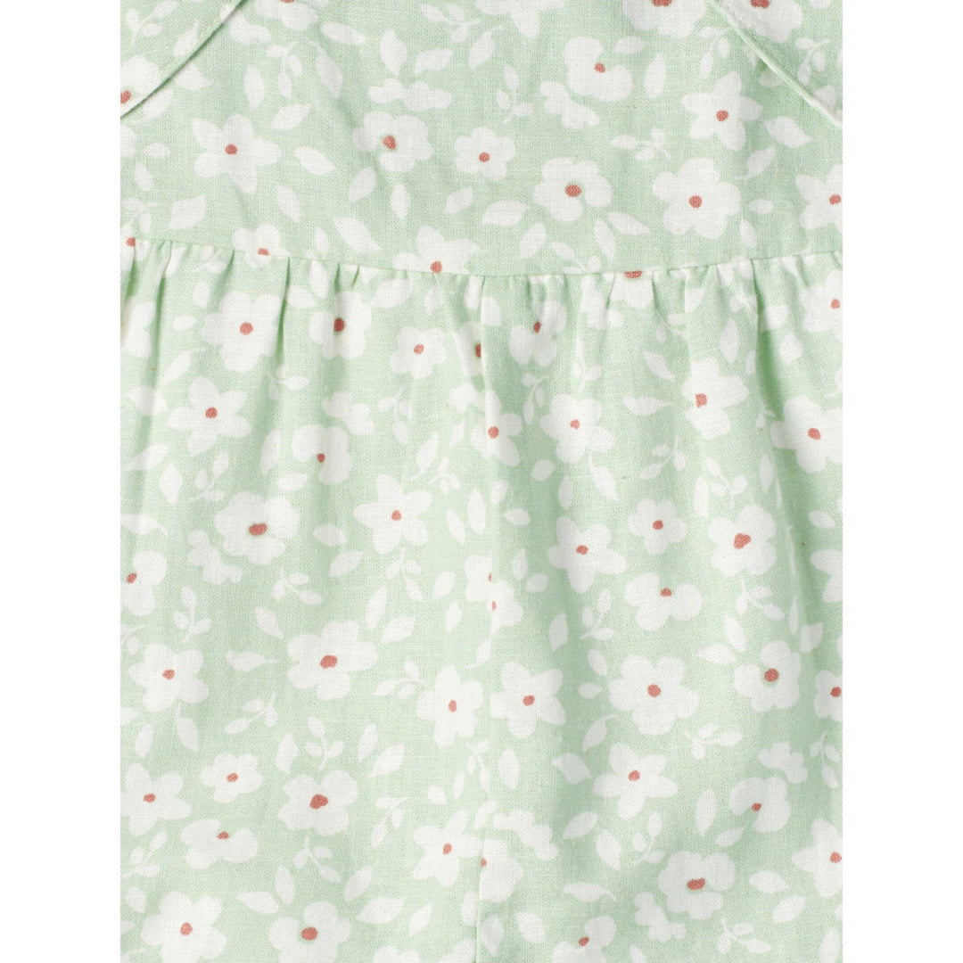 Modern Moments by Gerber® baby linen romper is made of a linen viscose blend that’s lightweight, breathable, cool, and comfy. Our essentials have been independently certified with STANDARD 100 by OEKO-TEX® so that you don’t have to worry about harmful substances in your baby’s wardrobe. This one piece romper includes shoulder-straps, front decorative tie and ruffled short in green floral print.