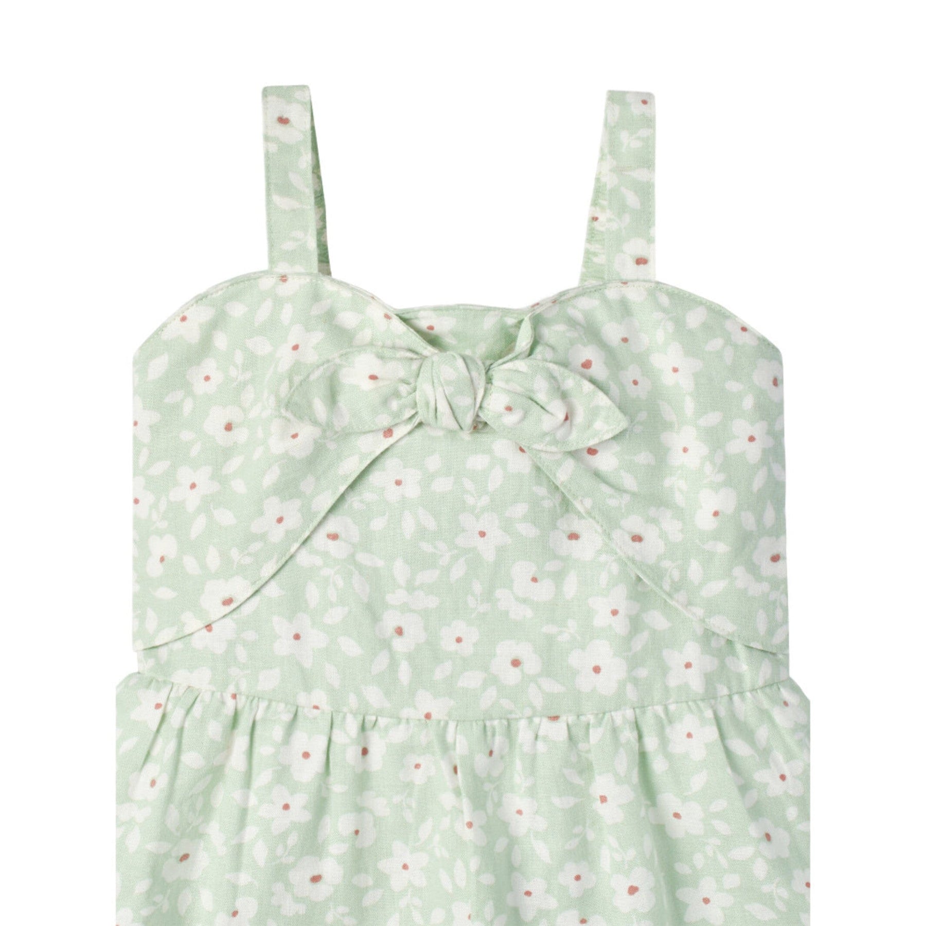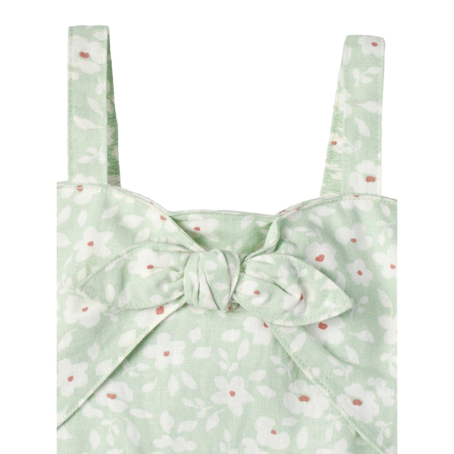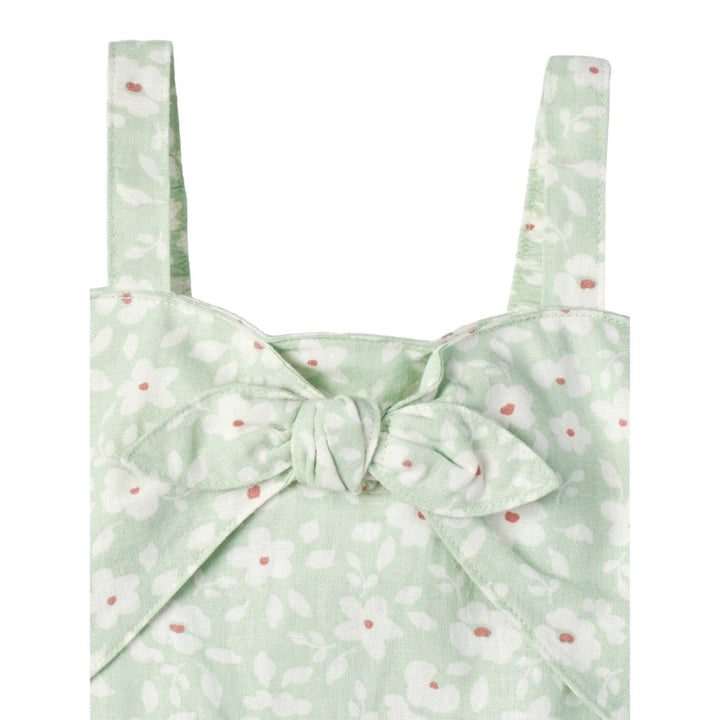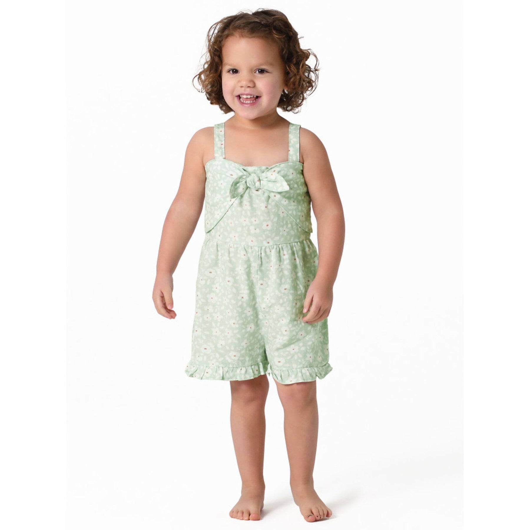 Modern Moments by Gerber® baby linen romper is made of a linen viscose blend that’s lightweight, breathable, cool, and comfy. Our essentials have been independently certified with STANDARD 100 by OEKO-TEX® so that you don’t have to worry about harmful substances in your baby’s wardrobe. This one piece romper includes shoulder-straps, front decorative tie and ruffled short in green floral print.