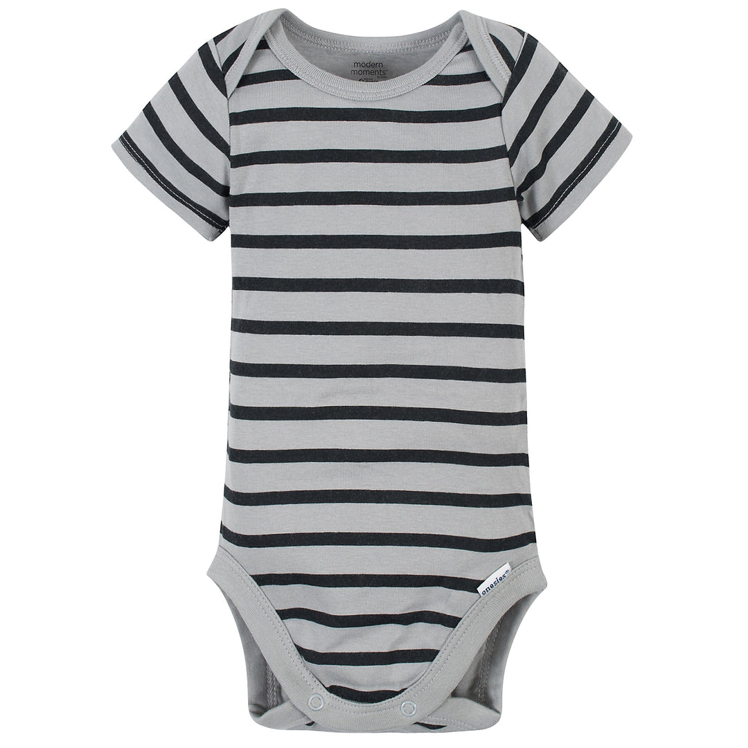 Modern Moments by Gerber®. Modern sophistication made with the quality and value you expect from us. Add a modern flair to your baby’s wardrobe with our stylish and practical outfit sets. This set includes four Onesies® Brand bodysuits, two pairs of harem pants, two coveralls, two pairs of shorts, two bandana bibs, & four pairs of Wiggle-Proof™ socks. With easy-to-change features and easy-care fabric, parents will love how convenient each piece of this set is, and babies will adore how soft and comfortable they are. Mix and match for fun, creative outfits! We had this set independently certified with STANDARD 100 by OEKO-TEX® so that you don’t have to worry about harmful substances in your baby’s clothing. The soft fabric is made with cotton with organic fibers for a healthy planet and happy baby. This set is machine washable and dryable. Give this set as a thoughtful gift at the next baby shower you attend.