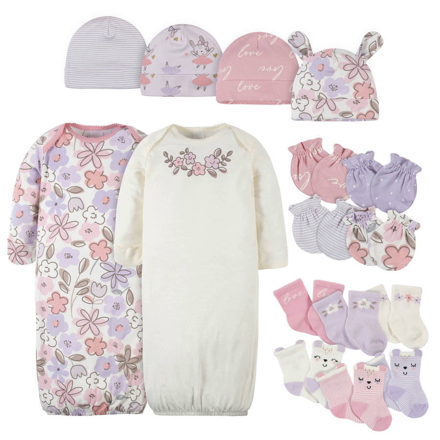 • Includes two baby gowns, four pairs of no scratch mittens, four baby caps & six pairs of Wiggle-Proof™ socks.