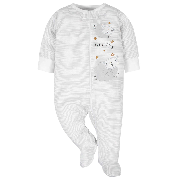 Fill up baby’s dresser in one purchase! Our sheep themed 17-piece set is perfect to set baby up for success. It includes four short sleeve Onesies® Bodysuits, two Sleep 'n Plays, four caps, three bibs, and four flannel receiving blankets. We had these products independently certified with STANDARD 100 by OEKO-TEX® so that you don’t have to worry about harmful substances in your baby’s clothing. All our Onesies® Bodysuits feature expandable lap shoulder necklines and bottom snaps that are positioned higher to keep changes quick and simple. The Sleep ‘n Plays are a new parent’s best friend! They feature front zippers for quick changes and are the ultimate, comfy loungewear for baby. The baby caps feature soft, snuggly cuffs for comfort and are perfect to mix and match. Use the bibs to keep everything clean and dry, and the flannel blankets for almost anything! Our flannel receiving blankets are a favorite among parents as they can be used indoors, outdoors, for snuggling, or as an on-the-go changing station. Our sets all coordinate so you can mix and match like a pro. They also make excellent baby shower gifts! Each piece is machine washable and dryable.
